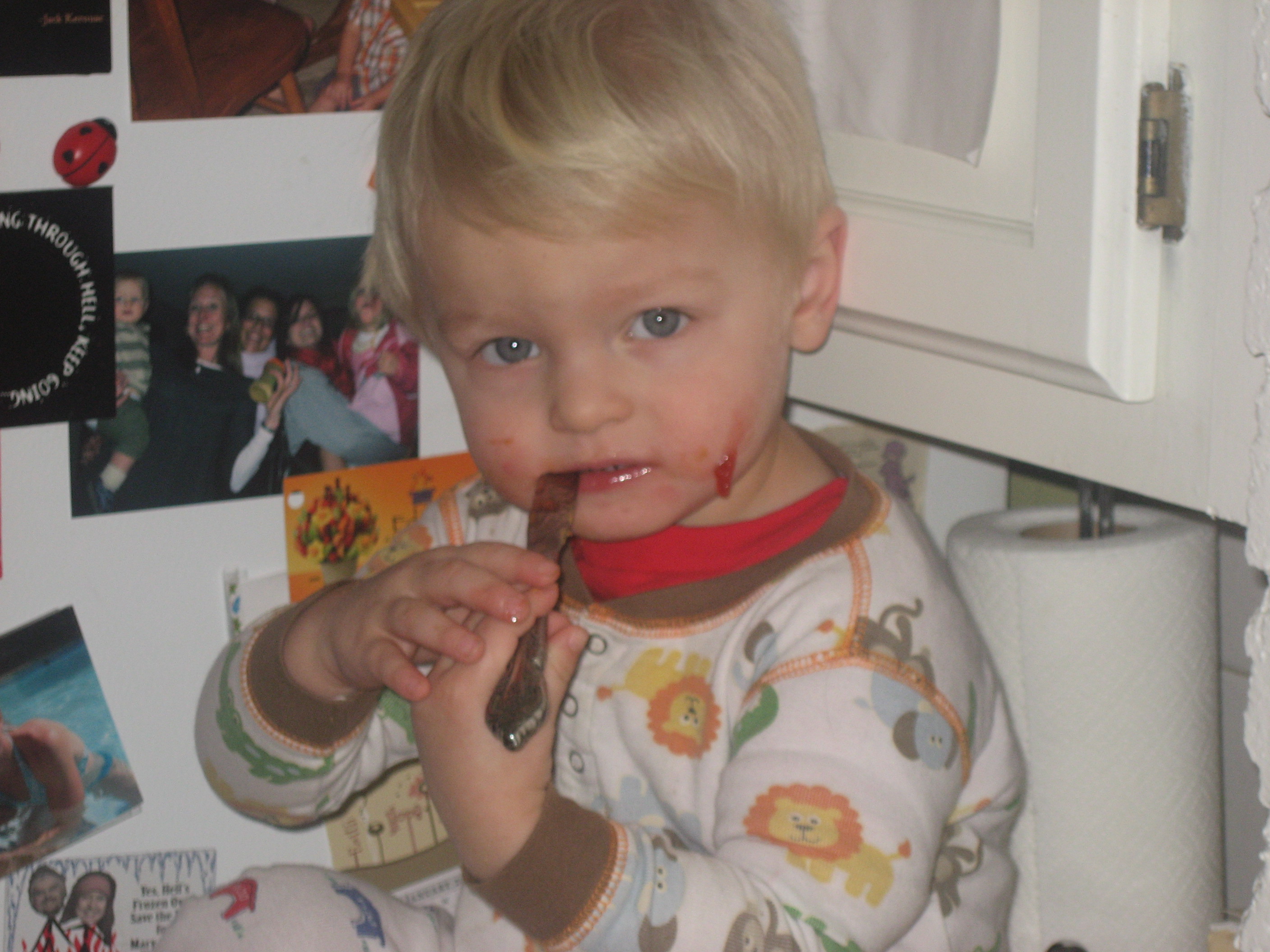 This morning he turned his hostility towards me as I tried to get him dressed. “No thanks mommy!” he continued to scream at the top of his lungs as I tried to slip his skinny little arms into a shirt. My patience continued to whittle away as I moved to his pull-ups. He struggled, he kicked, he scratched my arms. I finally grabbed both of his ankles and glared at him with my most wicked glare and firmly stated “Stop, Mario.” My words mixed with that air and floated right by him as he continued to fight me. Luckily, he is a mere 30 pounds so I can use my weight when need be to get the job done, which is what I did this morning. I finally got him dressed and stood him up only to get a big hug from him and a sweet peck of a kiss on my right cheek. “Moooommmy” he sang as held me tight. Don’t ask me how kids think, I simply don’t get it.