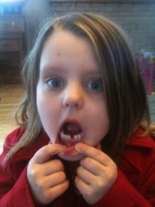 There was much excitement in the house this afternoon when my first-born, my little girl, lost her bottom center tooth.  It only started wiggling and jiggling yesterday.  I received a text at work from our babysitter informing me that Maria had a loose tooth.  Maria had told me this in the past but when I went to wiggle the tooth, it was never loose.  The fact that our babysitter had informed me of the loose tooth, however, made me believe that this one was not a joke.  I called the house and Maria screamed in the phone, “my tooth is loose, mom!”  I screamed with her and told her I could not wait to wiggle it with her.