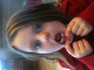 We met down at Mario’s school to pick him up, and I got to see it.  Precious little tooth standing at half mast with its buddies.  It freaked me out, quite frankly.  Watching her wiggle it with her tongue or her hand made me cringe.  We went to Chipotle for dinner and she had quite a time digging into her soft taco.  She was concerned about her tooth breaking off in the taco.  However, like the good eater she is, she refused to let her taco go to waste and she somehow found the courage to eat it.