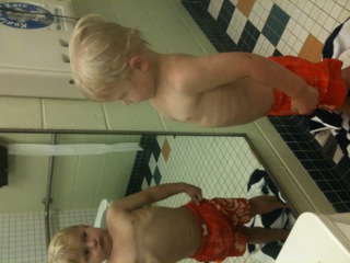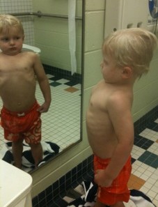 tub, in his room, and with Jon and me. When I took him to the pool today, he slashed away at the fountains acting like he was a good superhero and they were bad guys. He begged me to be Venom while he was Spiderman so that he could fight me and throw me underwater (I spent 15 minutes getting thrown underwater – I really deserve a mom of the year medal). Mario is also really into his muscles. They are not that big because he is so small but I have to admit, he is one cut three-year old. He is always taking his shirt off and looking at them, and he constantly notices other men with big muscles. Runners without shirts intrigue him (“Look at that boy’s muscles, mom!”). He thinks his dad can pick up anything because of his big muscles. He has taken to taking off his shirt in front of the mirror and flexing his muscles and puffing out his chest and yelling “Look at these muscles!” I guess it all ties into the super hero theme but boy I hope he doesn’t have some massive ego when he gets older. I can see him strutting his stuff down Grandview Avenue loving the thought of all the girls ogling over him. Then again, what am I thinking? Maria will so put him in his place.
