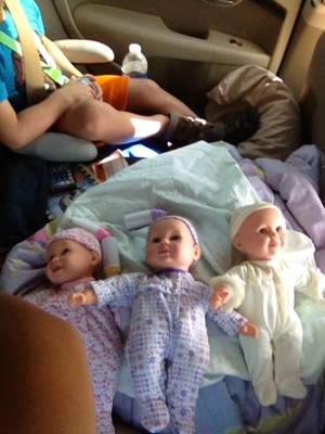 I am a grandma. Maria had triplets on Saturday afternoon – Sarah, Jessica, and Emily. She told me that the birth was easy and she was able to run around with them hours later. Their “births” occurred at Toys-R-Us in Kenwood on our way home from Louisville. She begged me to buy the triplets for her and I refused at first. But then I thought back to my days as a little girl with my dolls and I couldn’t resist.