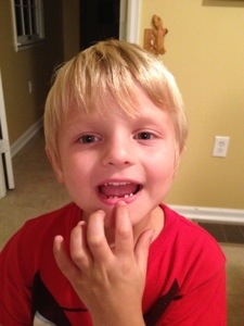 After a week of tugging and pulling, Mario lost his first tooth last night while eating a chicken nugget in the back seat of Jon’s truck.
