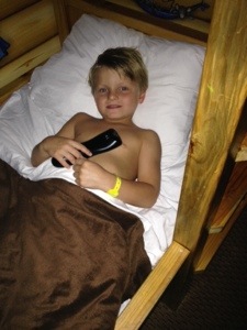 Forty minutes later, I was given wristbands and told all about the breakfast buffet and the late night MagiQuest game. We walked back to our room and the kids loved the fact that your wristband opened the room door. The kids ran in the room and checked out their bunk beds in their “cabin.” This is what grabbed Mario’s attention when he reviewed Great Wolf on his iPad. He thought it would be cool to have his own cabin. They fought over the top bunk and jumped from the top to the day bed. Jon and I cringed at the full size bed on our side of the room. There was no way we were fitting in that bad boy. Pull out sofa here I come.