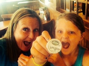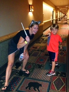 We returned to Great Wolf Lodge in the late afternoon. Jon and I were trying to figure out another place to go before heading back (oh please!) but the kids wanted to return. These vacations are all about them and so we sucked it up. This is when Mario found out about MagiQuest. This is yet another plot to reel kids in and force parents to dole out cash. $80 later we had our swords and our booklet. Mario was on a mission. Ri hung with him for a bit but then got worn out. The game requires you to go up and down stairs and through hallways. You do get your exercise, at least. We got Ri her ice cream cone and took her back to the room. Then Mario spent from 9:45 to 11 pm finding runes.