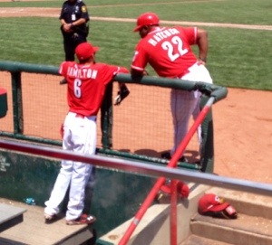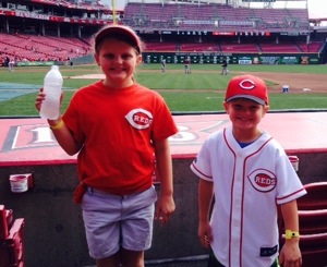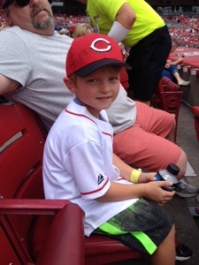We were the first ones in when the doors opened. Our seats were two rows back in front of 1st base. That is the closest I have ever sat to the players. I was in heaven. Ri and I walked up to the rail and waited with throngs of others for autographs. I had not thought to bring a sharpie so all we had was our ticket stubs and an old pen. But Ri cranked one out from Rosie Red and Donald Lunz. Mario ran up when Ri was getting Lunz’s and was able to get one, too. We kept trying but ushers were pushing back. As we were walking away, Billy Hamilton came out. We happened to be standing close. Mario took off his hat and swung it at him begging for an autograph. A man standing close shared his sharpie and it was history. Mario had his first autographed cap. Ri was dejected at first but then we talked about being happy for one another and sharing in the joy that others’ feel. She really gets that at her young age and she shook it off and started waving her foam finger.