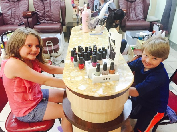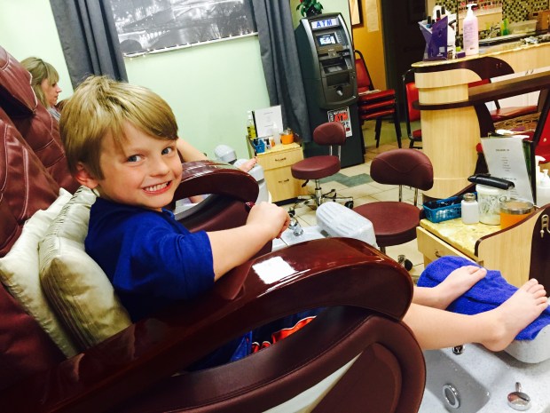 Mario, my son who flipped out when I asked him to wear a polo shirt that had pink trim on it, decided he wanted a pedicure. Jon was out of town and I had promised Maria Grace a mani/pedi prior to her birthday. There was only one day in the entire week that we didn’t have something going on so Mario was stuck coming with us.