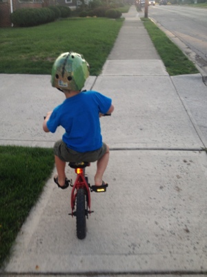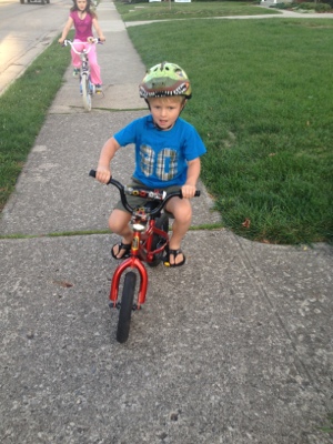Tonight, he biked on the sidewalk of our street. He cranked out three or four house lengths before rolling into the grass and starting over. Incredible. Just last week Maria complained about Mario never wanting to try the two-wheeled bike and Mario was adamant that he would not give into her complaints. He had no desire to ride a bike sans training wheels. But something or someone changed his mind on Sunday and now there is no turning back.