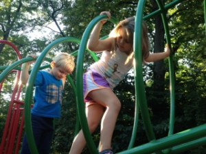 We moved around all night long – trying out the monkey bars and running down the huge grassy hill.  We could finally breathe since it was only 84 degrees compared to the 100 degrees it had been for the last few days.  I love these types of nights – biking to the park and spending time outdoors – I will take that over a car and sitting inside any day.  So here is to more research on the benefits of moving around a lot – I will be your test bunny!