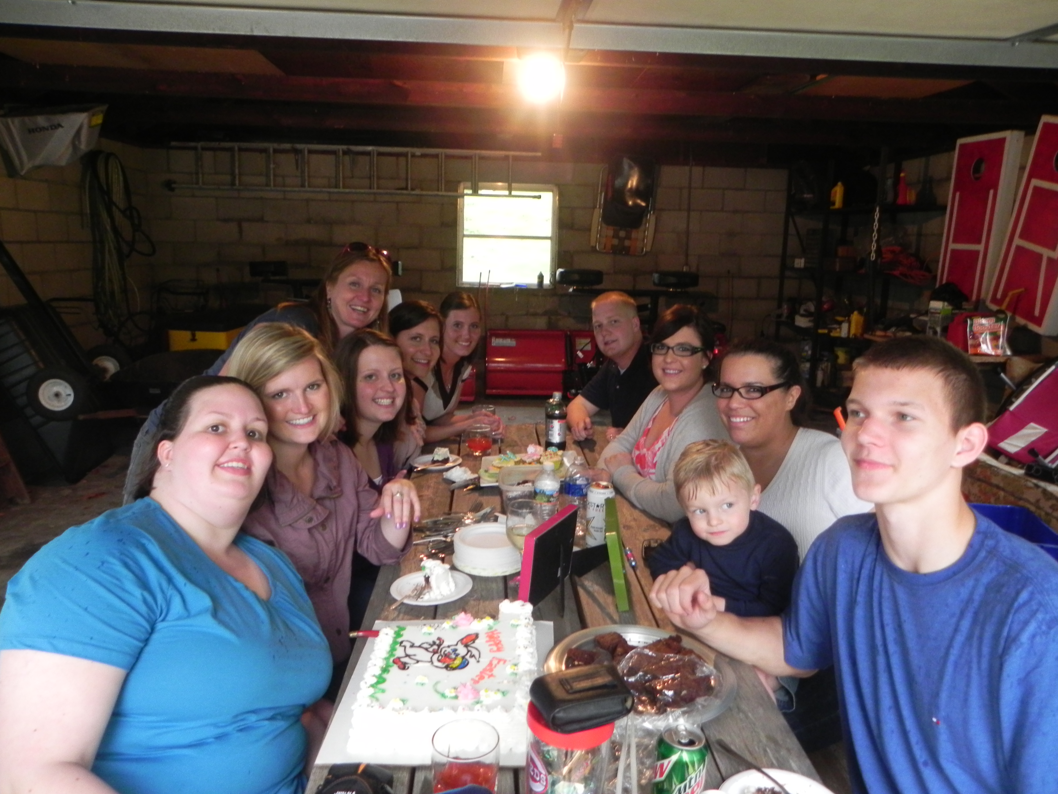 After eating way too much food (including insanely gorgeous red velvet cupcakes with cream cheese icing ala Meg-pie), we hopped in the truck to head to Grandma Heile’s house (now owned by my cousin Laura since Grandma died last Summer).  Maria was all excited because she had on a gorgeous Easter dress that she knew all of her girl cousins were adore (she loves dressing up for them because they ogle over her all day!).  Mario was excited because Robert and Cy, our high school boy cousins, would be there and he could stand in awe of them playing basketball and toss the ball with them.   Maria got the attention she expected and she even scored some potato salad from Aunt Jane (her absolute favorite food after pasta and meatballs!).  Mario got to throw the volleyball to us after each play (although he would only throw it to Robert most times).
