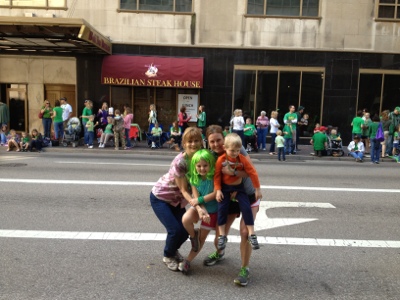 We headed to the St. Patrick’s Day Parade in downtown Cincinnati at 11 am.  I had been looking forward to the parade for the last few days.  In all my years growing up in Cincy, I never hit the parade even though I lived in Clifton and worked downtown for years.  Also, the kids had never seen downtown since we always stop at the Blue Ash line.  I had big plans to go to Bicentennial Commons and the Riverfront but those were squashed after the long parade.