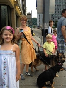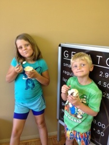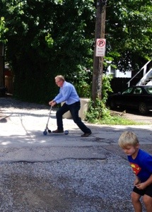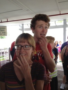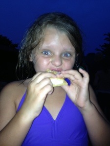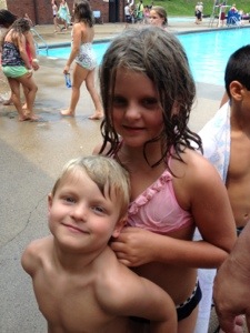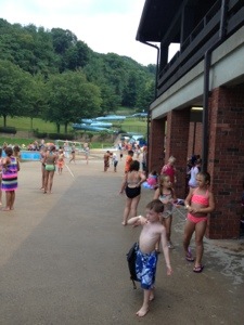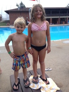 On Friday, we hit the Wheeling Park pool. It had a water slide. A nice sized slide at that. The only problem was that it kept thundering and the guards would shut the pool for 20 minutes with each round of thunder. Ri wanted to call it quits bit Mario wanted to stay. What else were we gonna do? We made Ri stay, bought hotdogs and soft pretzels, and played charades. The kids put on our flip-flops. Nothin’ better.