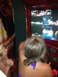 We hit the game room last – we had avoided it the whole trip. It was a small little room with only a few games. Jon and I competed on Ms. PacMan and the kids drove fast cars.