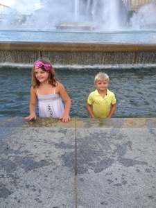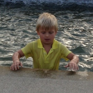 We returned to the hotel and did some more fishing and paddle boating. Maria had been longing to head into the fountain in the middle of the pond when we went paddle boating the day before but I had nixed the idea. When she pouted, I steered the boat just enough into the fountain that she got wet and I just got a drizzle. On Thursday, I decided to let her go for it and steer us right into the fountain. And she didn’t flinch. I got soaked to the bone with her. The smile on her face made my heart happy (a saying I got from Meg-pie). Jon and Mario stayed on shore trying to catch fish. Mario gets so angry and frustrated when he doesn’t catch one. There were little fish that would swim up to the bait and nibble at it until it was gone leaving none for the bigger fish. This got Mario red hot.