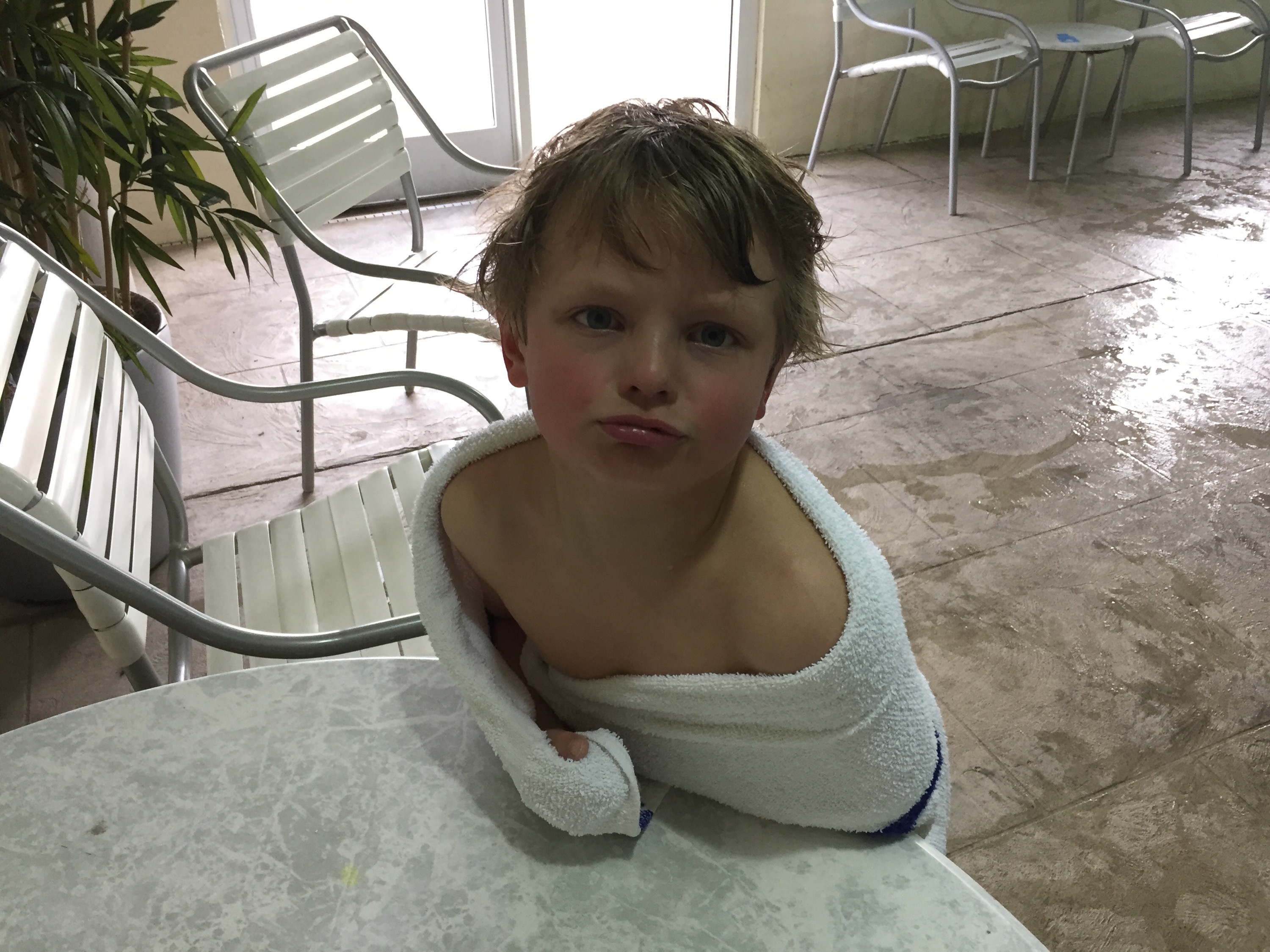 We filled up on DQ after dinner and hit the sack. The kids woke up at 7 am (even with the dark curtains in the room)so what else to do but throw on our suits for a morning dip. The pool didn’t open until 9 am but who could say no to these two munchballs?! Then we got treated to the Farfield Inn breakfast buffet – pancakes and eggs and muffins and fruit loops!