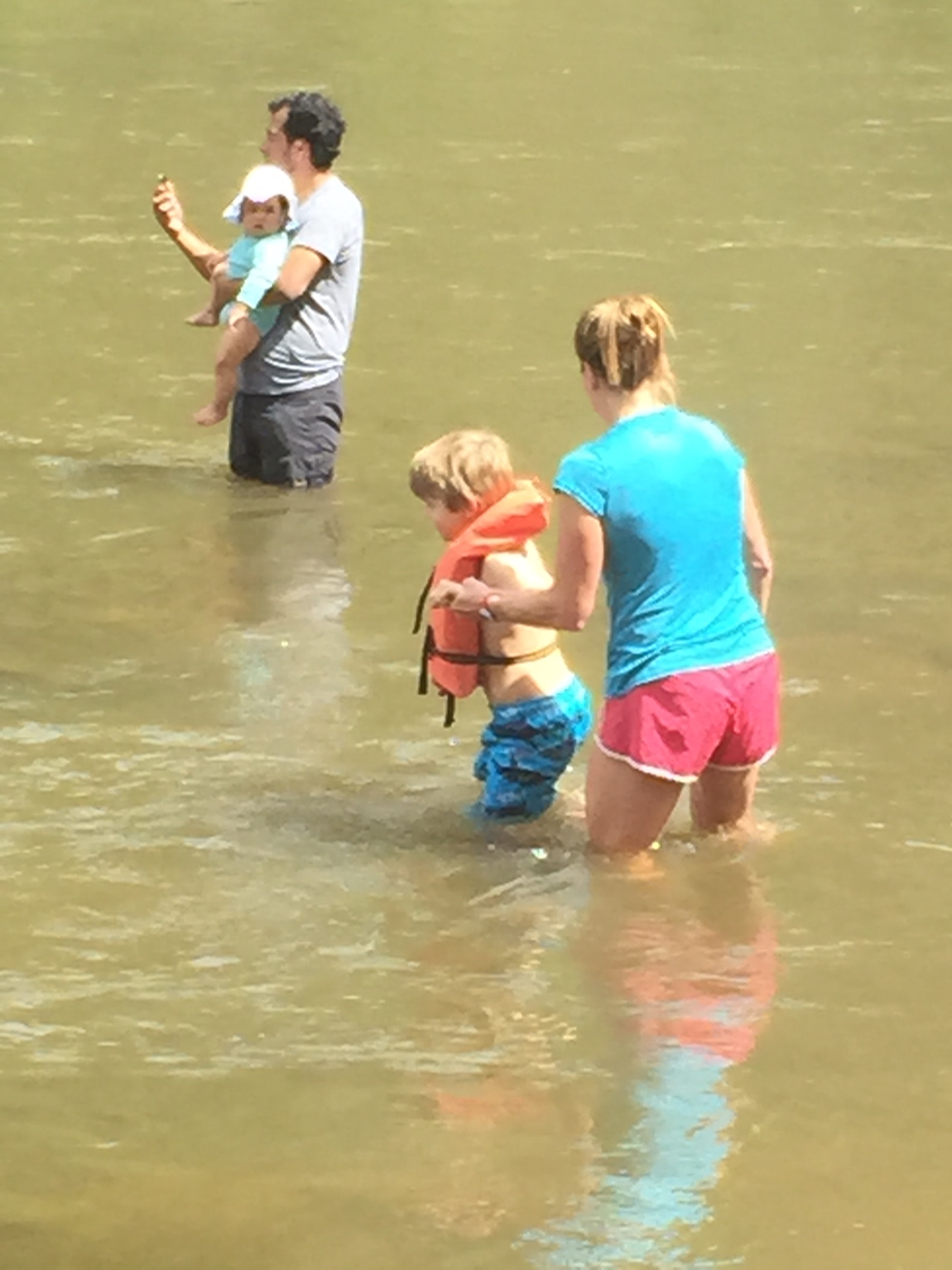 Mario returned without a fish in hand but happy that he got to go out. Beckett caught one that Mario described to us. The kids wanted to canoe in the river but we all agreed it was a bit too much for us to handle. So we decided the kids could put on their suits and wade. But before I could get down there with them, I see Ri waist deep with Sarah!