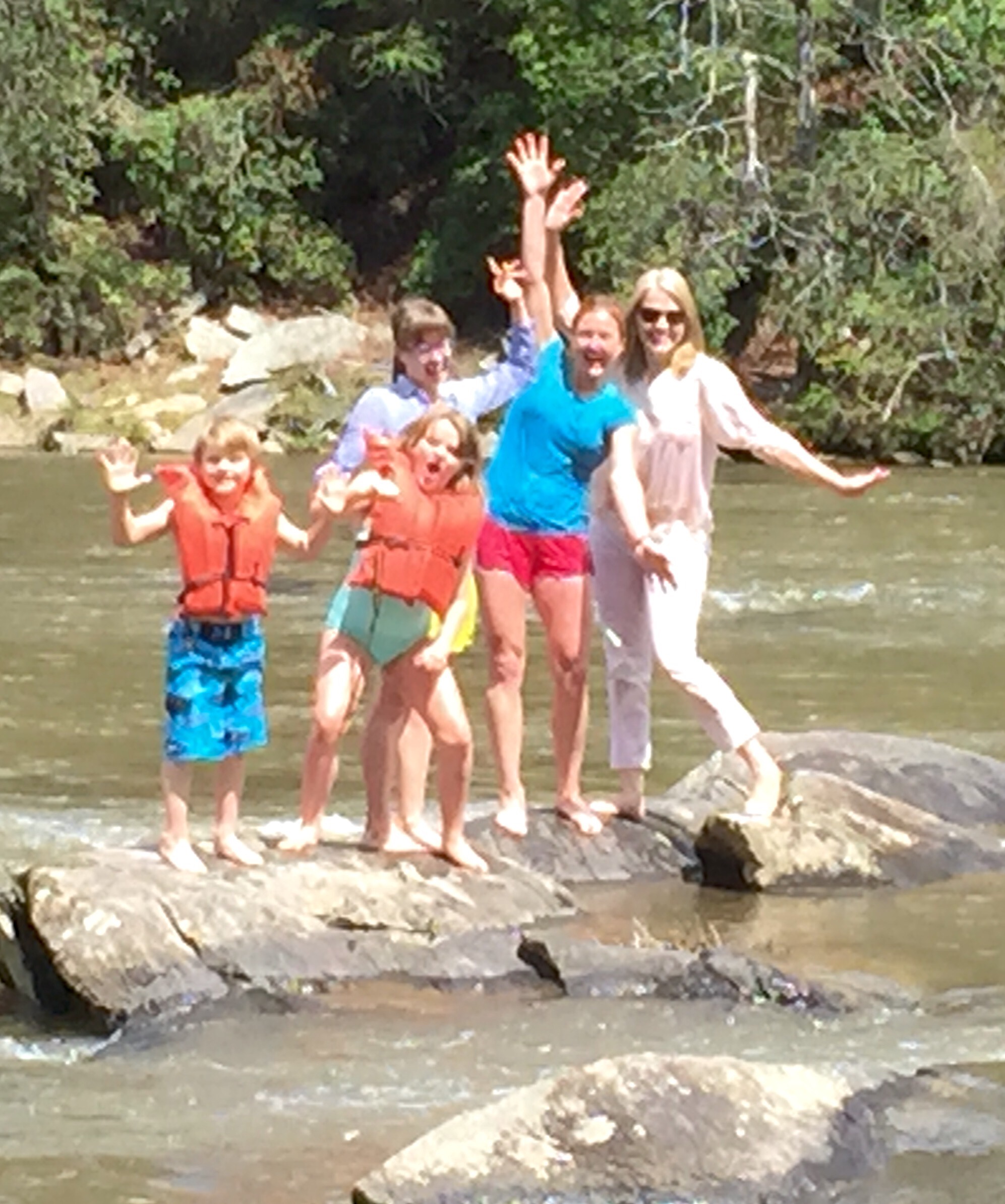 Jon and the cousins were rooting her on as they stood on the shore and the rest of the crew cheered from the deck at the lodge. But then we had to return to land, and I dreaded it on behalf of Mario. He was genuinely nervous. Aunt Ann didn’t help the situation at all as she was the first to head back and get caught in the rapids. She slipped on a rock and tried to get her balance but the current took her and she fell – entire body up to her neck – in the river. I couldn’t breathe I was laughing so hard as I climbed over the rocks to save her. Uncle Joe, our firefighter, waded out to help. Those white pants suffered but we got her back to shore. Mario was next. And then Sarah and Ri made their way back as if walking on air. Ri stayed in the water for another fifteen minutes as we dried off. She could live in the Arctic in shorts and a tank top. I cannot understand her tolerance to cold!