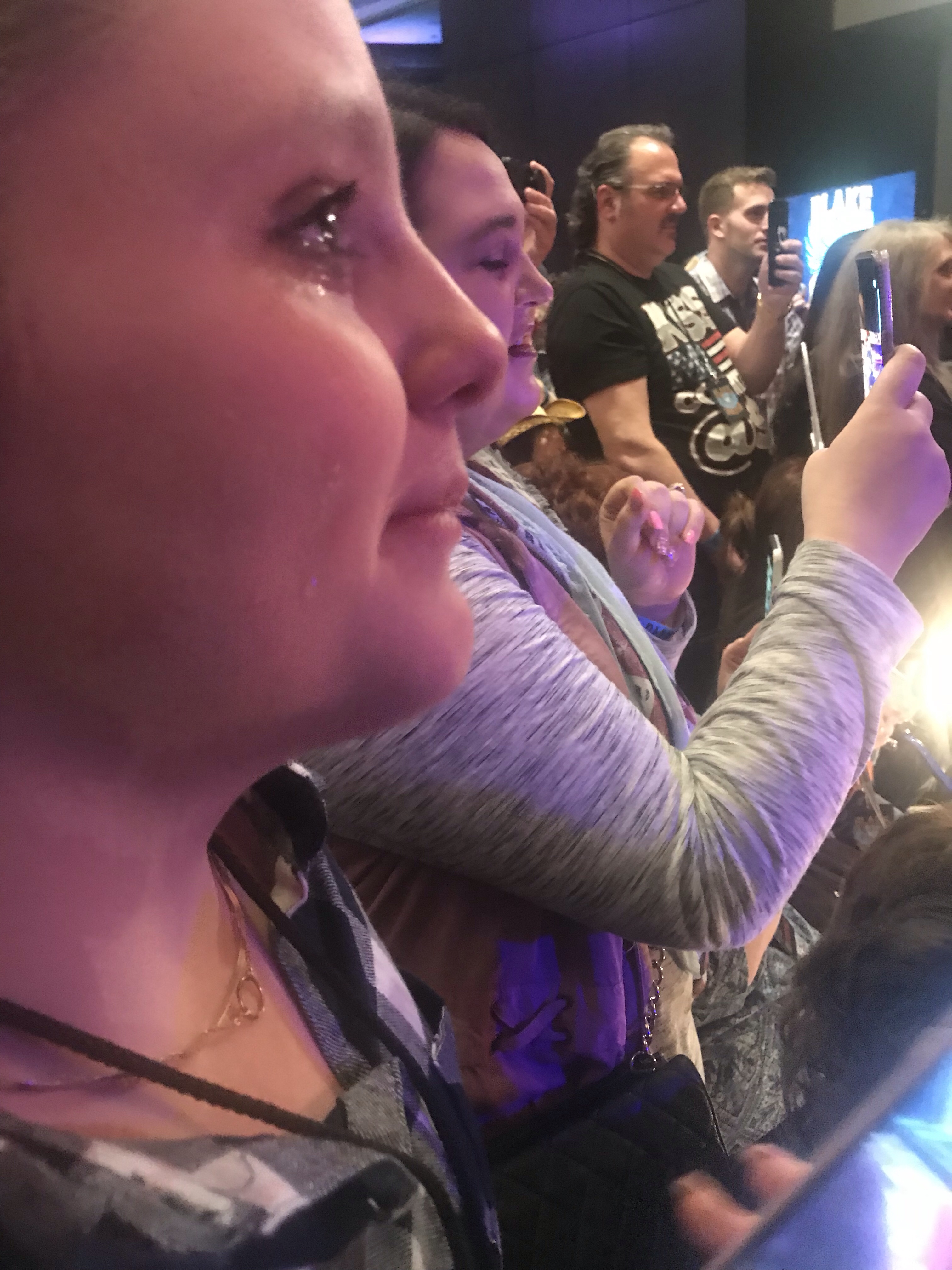 7 PM arrived and fans were antsy. People started chanting Blake’s name. Maria continuously darted her eyes back-and-forth to each side of the stage to determine whether Blake was behind the curtain or not. Each time a song would end, the crowd silenced with the hope that his stage manager would be introducing him. But then a new song would start up. Finally, at 7:15, the stage manager bounced onto the stage and without much fanfare, introduced Blake Shelton. Maria immediately bawled when she saw him first come out.