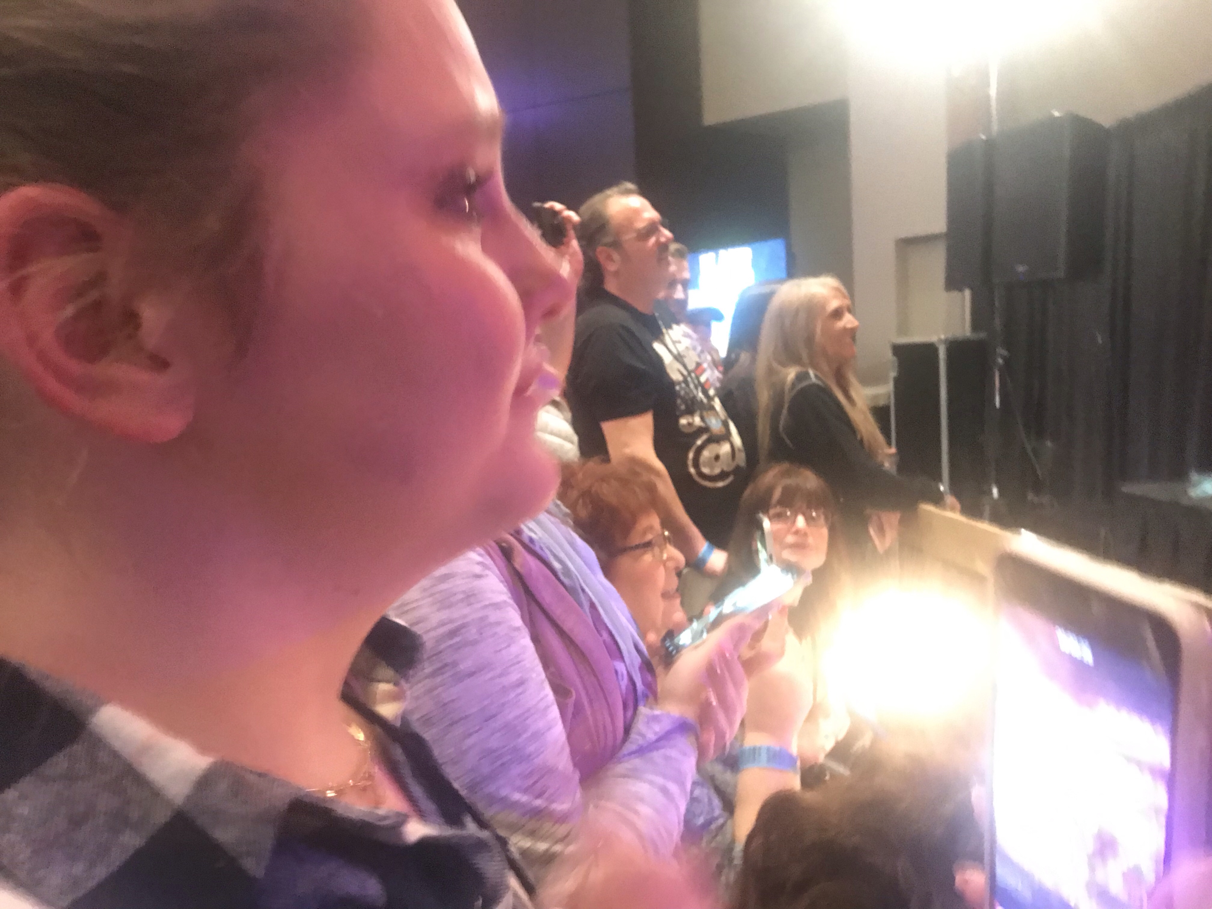 Maria stood twirling her lanyard anxious to head back. After what seemed like forever, they began to escort us through the hallways to the lounge. When we arrived at the lounge, there were escalators to the left. The guides were escorting fans down the escalator to get merchandise. However, when we got to the bottom, people were going back up to the lounge. I knew we had to be one of the first to enter the lounge or we would not get close to the stage. So, Ri and I left the merchandise counter (the next day I realized we got one free item with the VIP package that we lost out on) and squeezed in the line to enter the lounge. We saw the Voice chair as we walked in, and a small stage over to the right with a wood fence in front of it. There was already a group of older women and men who had placed seats against the fence to create a front row. Maria and I darted directly in back of the seats. People were starting to move over towards the area and we knew that if we left our position somebody would grab it. Maria and I quickly realized that we would be standing in the same spot for the next 2 1/2 hours.