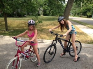 All of this leads up to my sweat experience this afternoon. Jon’s niece, Sherri brought her kids over today while she and her hubby went to a charity golf outing.  We decided to go to the pool.  Of course, a normal human being would have loaded the kids in the car and headed to the pool.  But, alas, I have never been normal (thanks dad and mom and Meg).  Maria wanted to ride her bike.  Emi wanted to ride mine.  Eli wanted to ride mine, too, but she is not quite tall enough.  Mario wanted to ride his since Jon fixed the seat and he can actually move pretty quickly.  So, we packed up all the towels and goggles into the stroller and set off with Eli walking with me and the rest of the crew biking.