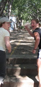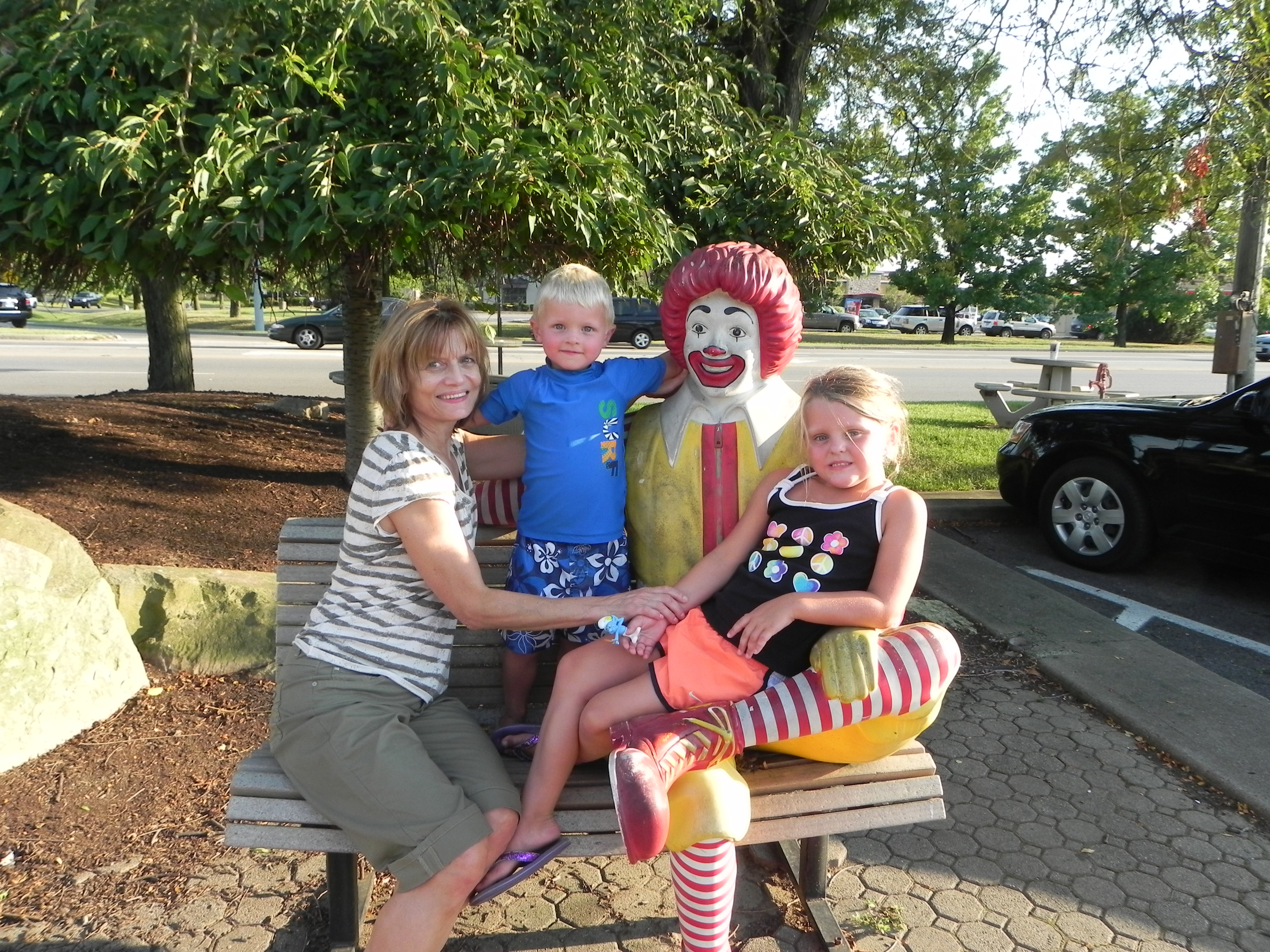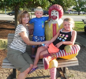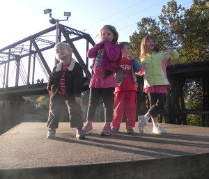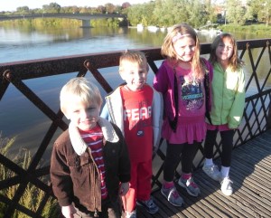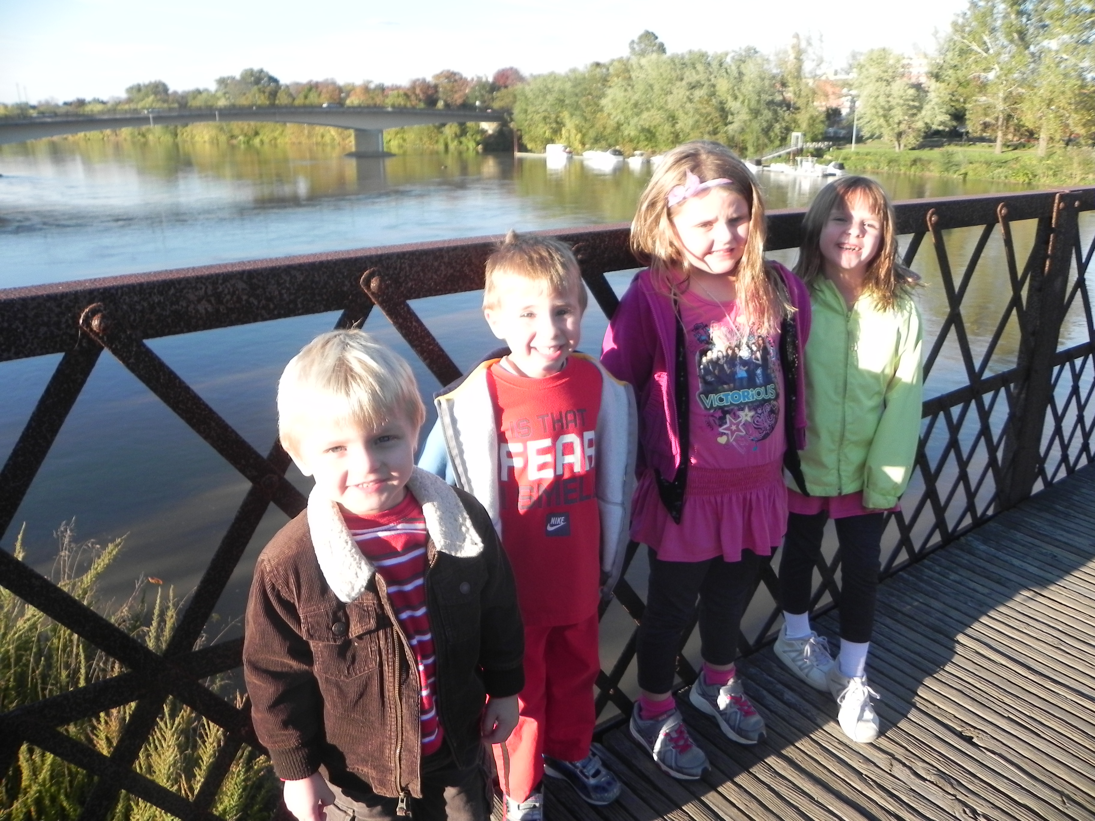 We hit the road back to Columbus around 3 pm – close to four hours after I thought we would take off. But it was well worth it between the zombies, hanging out with family we rarely see, watching the kids enjoy the hotel and the pool, spending time with Patty and maybe best of all, taking in the beauty of Marietta’s changing leaves and old bridges and wide river. I felt ready to move and walk and hike with the gorgeous outdoors. When we got home tonight, Mario begged me to sleep with him. I gave in and rubber his back and Maria’s legs for a while. At one point, I mentioned that I wished we were back in Marietta. Mario shot up and said “Why, mom?” I answered that I liked waking up to no schedule, seeing the river, hanging out with grandma and grandpa and all of the kids. He looked at me quizzically and then responded “But why would you like Marietta – there aren’t any pigs or baby monkies?” He knows those are my favorite animals but to put those two together cracked me and Maria up. A good way to end the weekend.