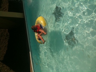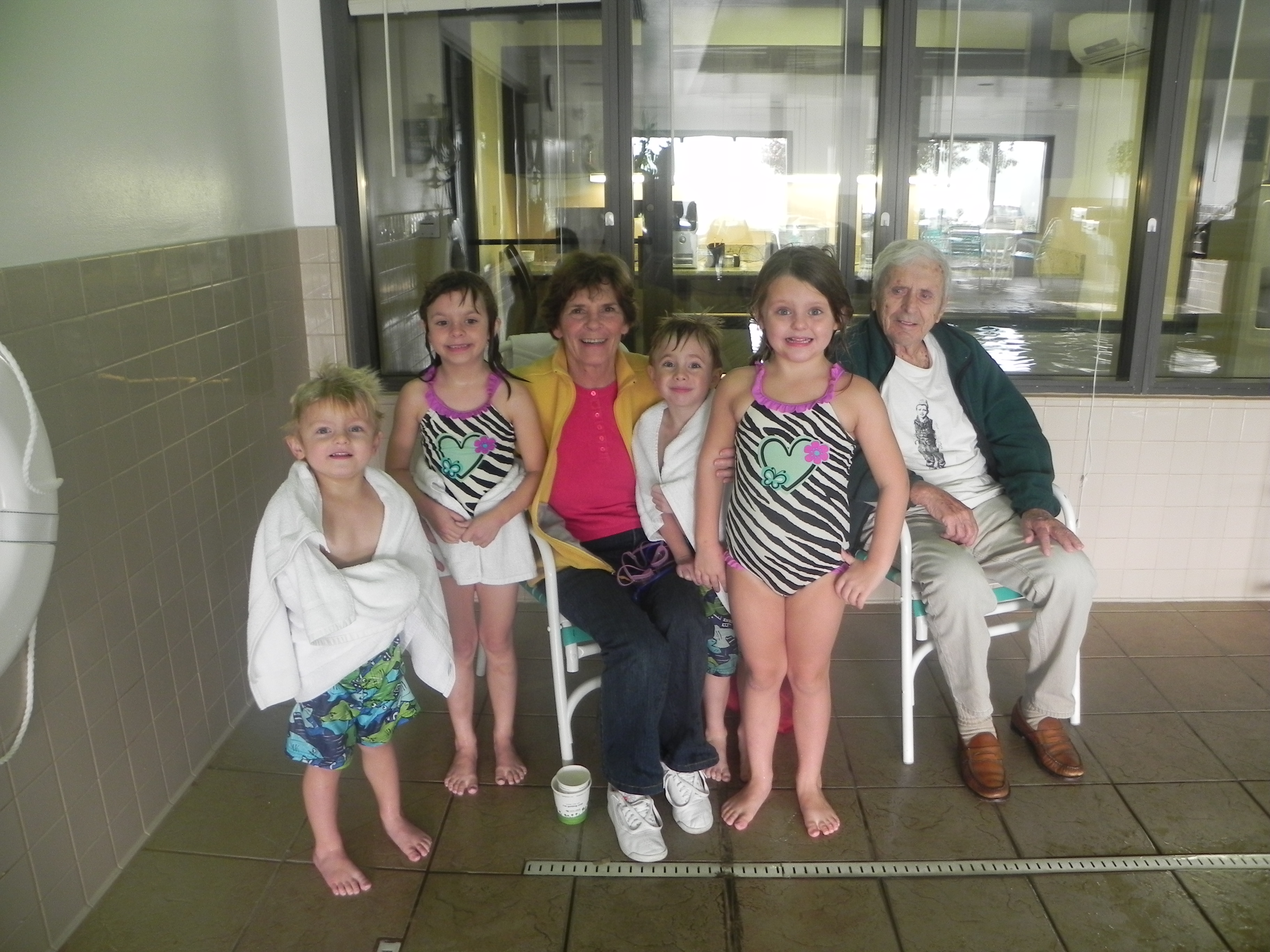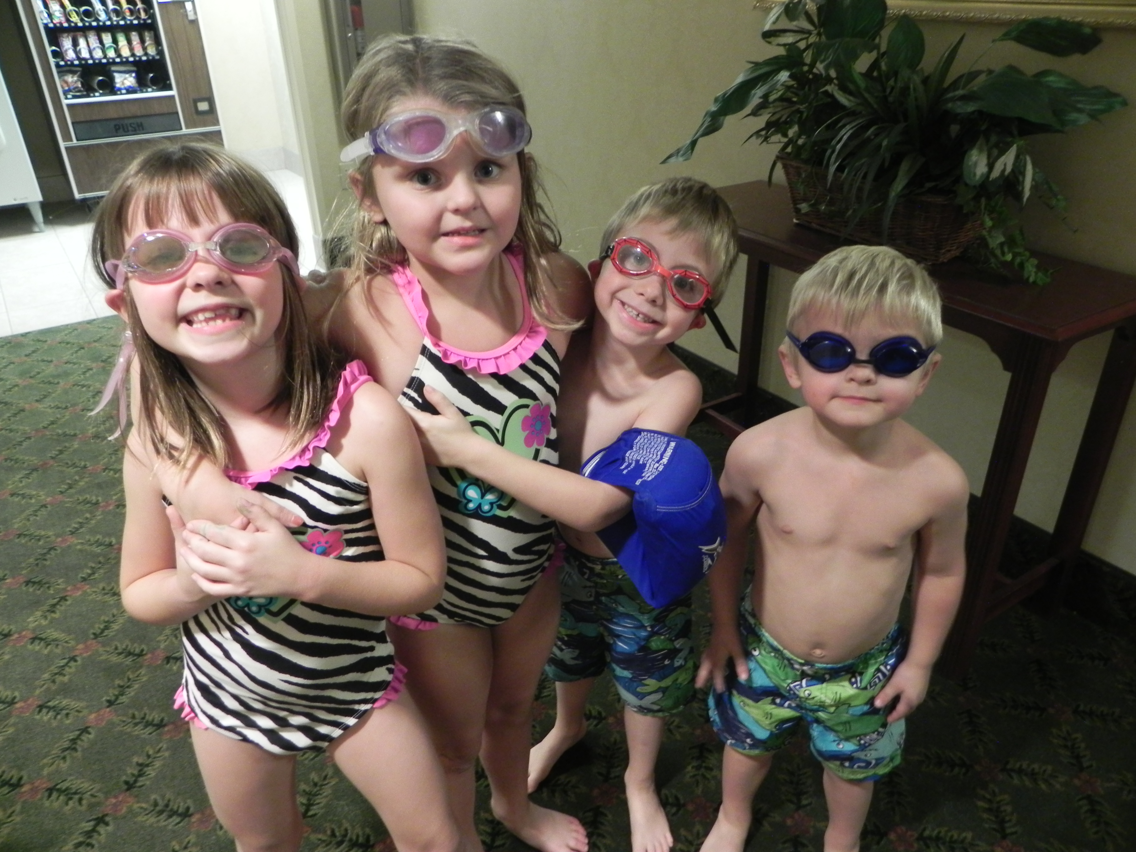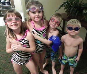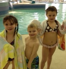 The girls decided they wanted to sleep with me and the boys would sleep with Patty and Joe. We threw our clothes in the rooms and decided it was time for a swim. I love seeing the kids’ faces light up when you tell them that we can go swimming. Swimming in a hotel pool is like heaven for them and they get so excited and slap-happy whenever they know they are able to go. The only downside with this pool was that it did not have a hot tub for Mario. I was glad of this fact because I do not like him going in them (I know kids should not be in really hot ones – we have had mild ones in the past) and if I was not around, he would want to sit in one for an hour. Luckily, this hotel had a fairly warm pool so Mario was not purple when he came out. Patty and Joe went to Patty’s sister’s house to start the food while I took the kids to the pool. Mild chaos in the pool area but nothing I can’t handle; I don’t know how parents have four kids willingly though. I played around with the kids for a while and then let them play together (I am really trying to get Maria and Mario to play by themselves or with each other and not rely on me). Mario is so funny in the water – he goes like a madman swimming and splashing and jumping – and then he just completely peters out and wants to leave right away. The others just play around, lounge on the side, splash a bit, and could stay there all day.