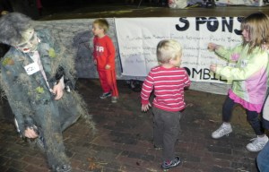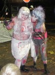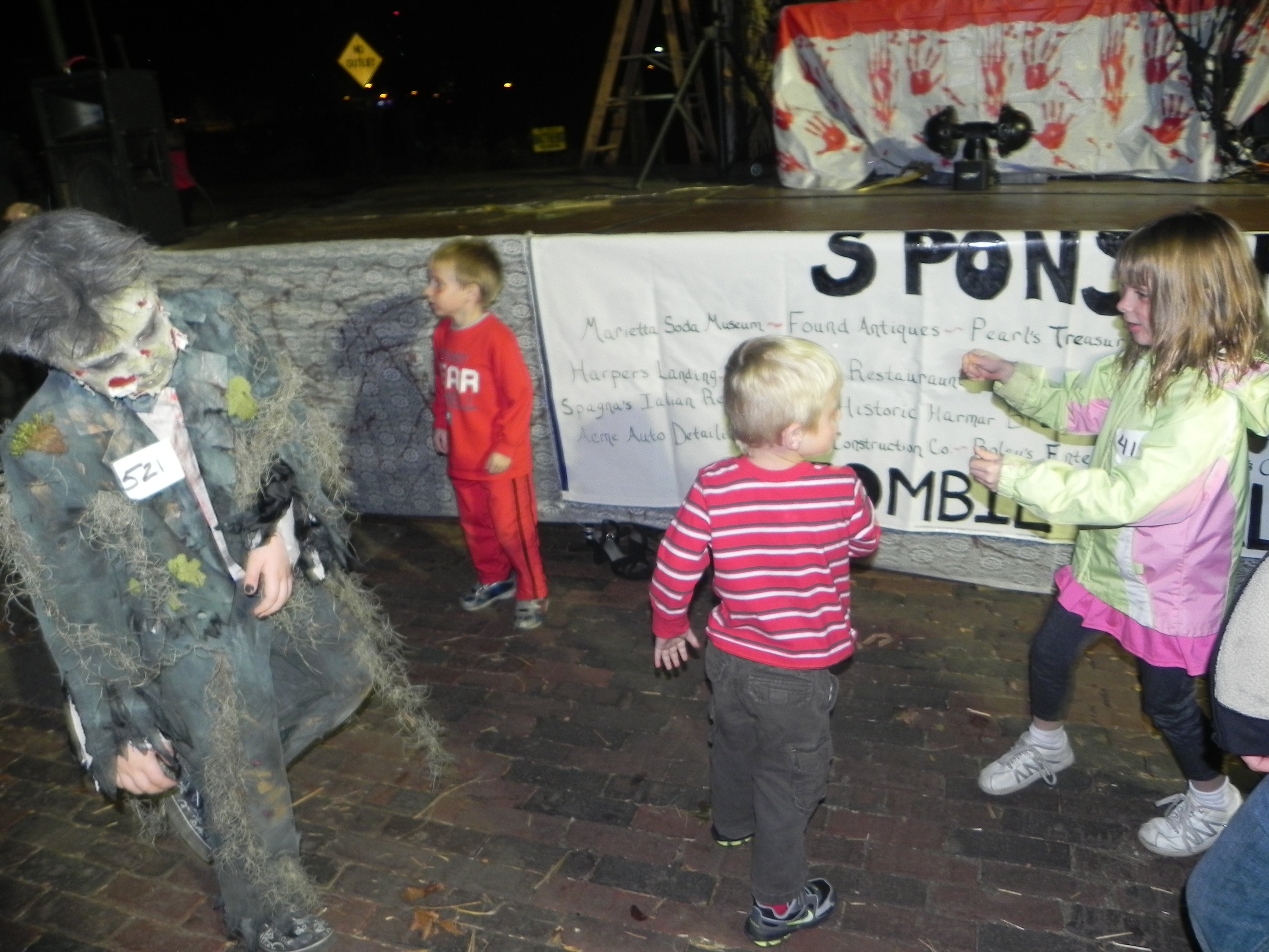 After the pool, we headed over to Patty’s sisters’ house, Aunt Mae (Mario loves Aunt Mae because that is the name of Peter Parker’s aunt). She lives right on the river and her house also ended up being the center stage for the zombie contest. The stage set up right outside of her house so we got to see zombies parading the street all night long. Patty and I were not sure whether the kids had to dress as zombies or whether they could enter the contest in their other costumes since we had never experienced a zombie fest before but it ends up they would have looked very out-of-place as an angel, a groovy 70s girl, a pirate and a transformer (unless they would have put fake blood all over them and tore their clothes up). Everyone dressed up in some zombie fashion. Alana begged to put fake blood on her and ragged clothes. Patty drew red lipstick on all of their faces but we could not find any old clothes that fit. Maria immediately asked to have the lipstick taken off. “It looks really dumb, mom.” When Alana started dragging her foot down the street and tucking her arm into her shirt in order to look more like a zombie, Maria rolled her eyes at me and whispered “we look dumb trying to act like zombies when we don’t have real costumes.” That is a huge difference between Maria and Alana: Alana very much acts like a 6-year-old girl – playful and silly whereas Maria very much acts like a 40-year-old executive woman – serious and direct.