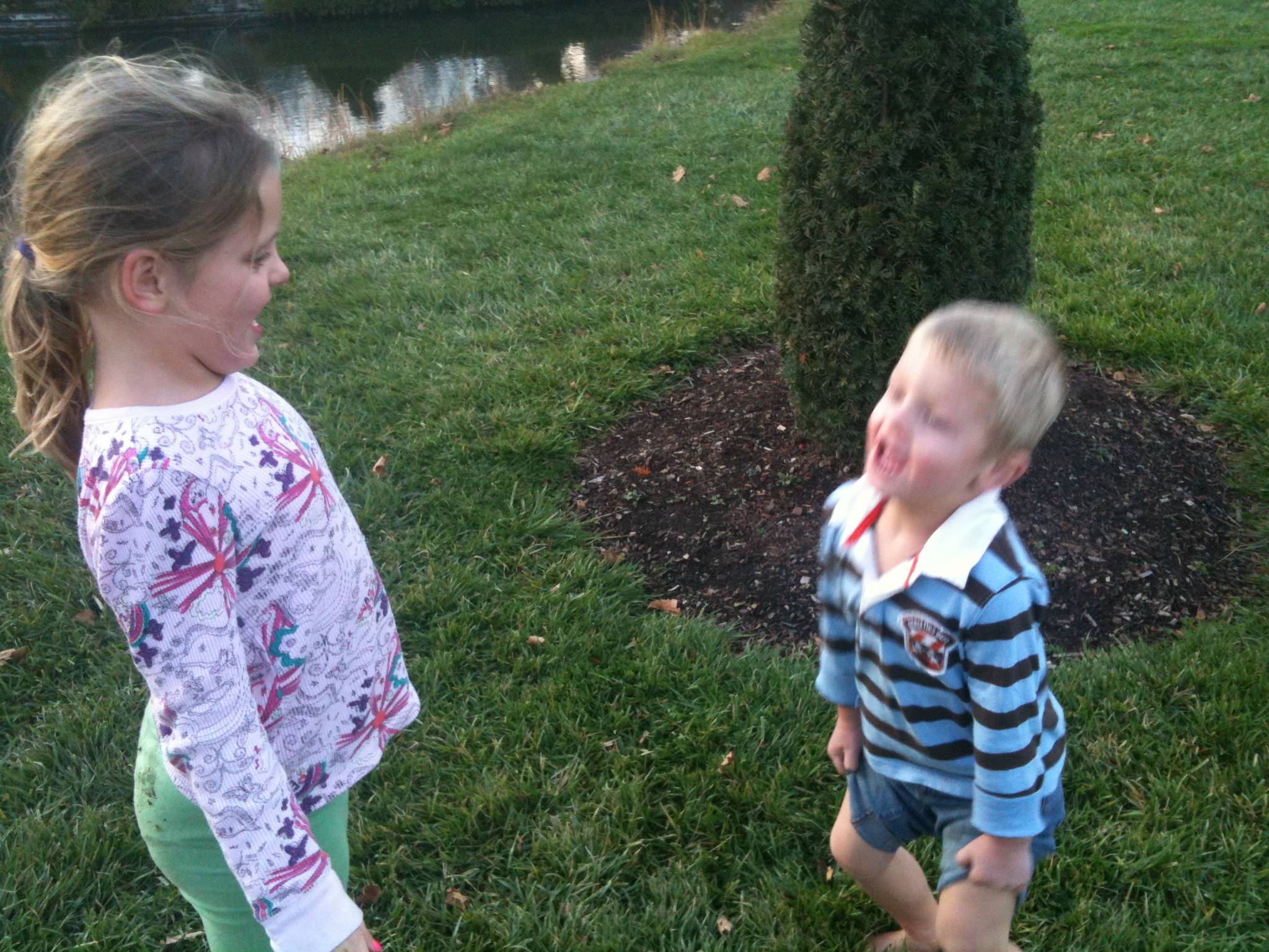 This swimming episode was a little more chaotic because I got under water with them, threw them, and let them play “beauty shop” with my hair (much pulling and water splashing). But, what our trips for if not to hear the laughter of children happy to be able to do whatever they want to the adult in the water?! We swam for nearly an hour and half and then forced ourselves out to get showers and head back to Mae’s. It was a splendid day outside at 64 degrees and the leaves changing colors to vibrant reds and yellows and oranges. The kids and I did another walk over the bridge to the other side of the river and got sticks to pretend we were fishing off the dock (we had taken a walk on Saturday, too, which was so wonderful up until the time that Mario looked at me with that “I just pooped” look on his face and we had to do an emergency throw away of his undies as well as a poop under the bridge). The kids found a platform to climb, also, and they acted out a play about a girl who wants a car and her mom refuses to get her one. Hilarious.