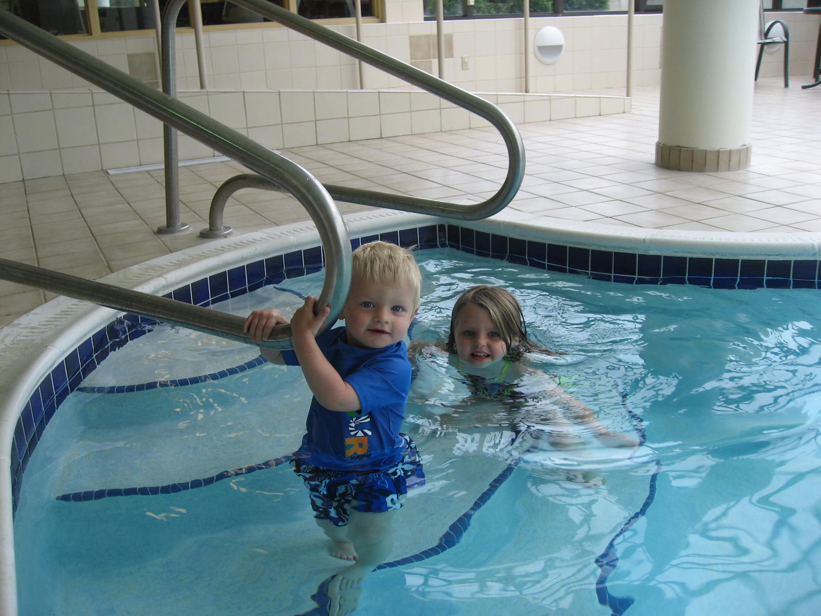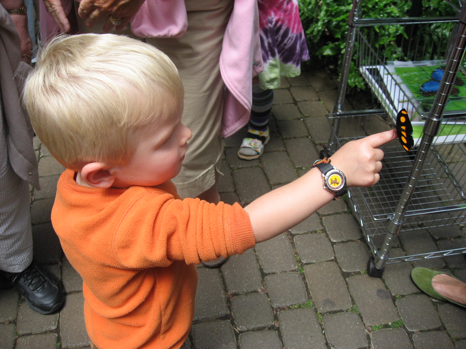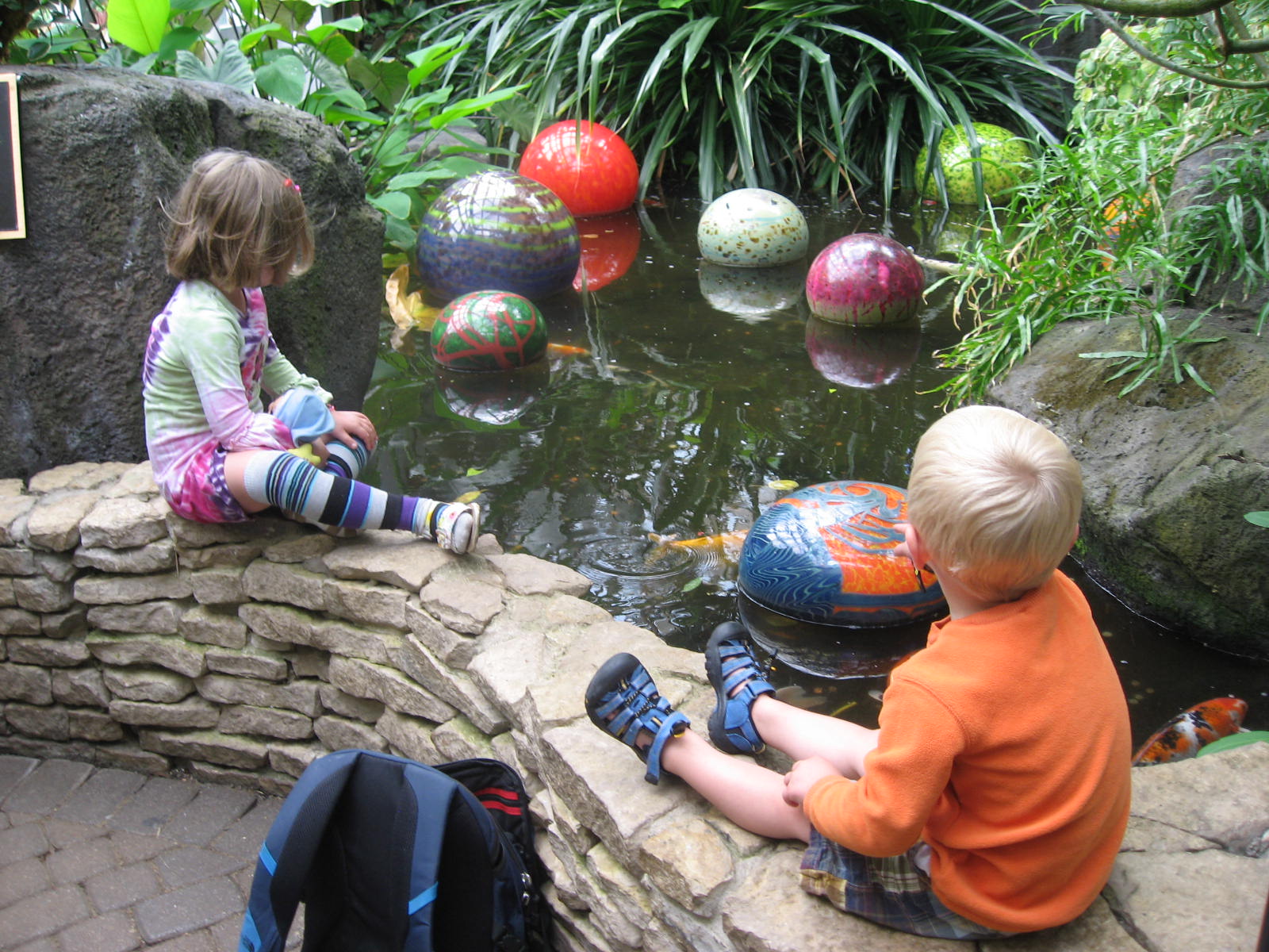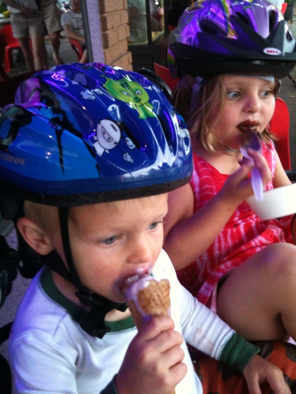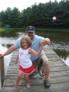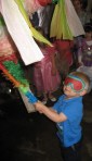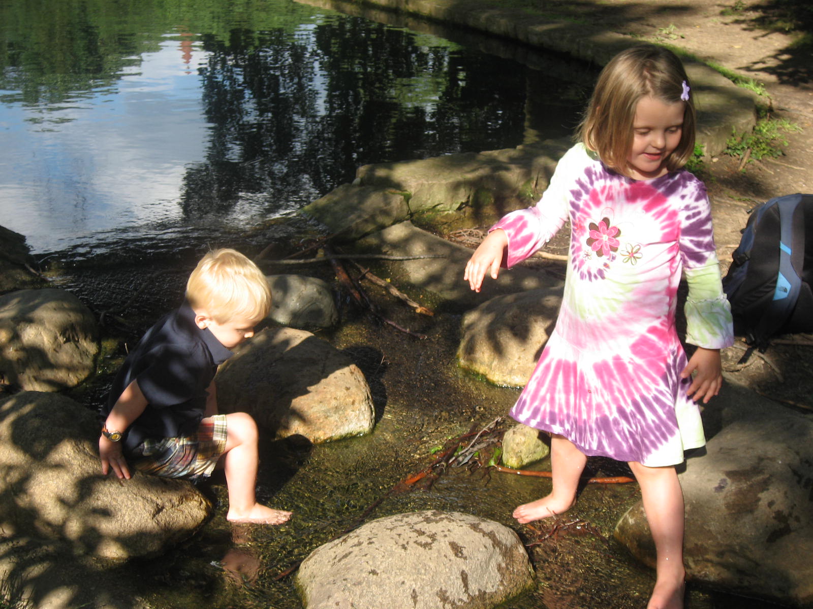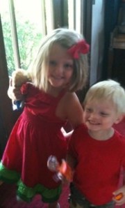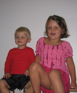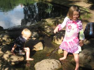 We rushed home after the hunt and hopped in the car to the farm. Within five minutes of walking in the door, Maria and Mario and their cousins found the baby chicks. Tiny and precious and so delicate. Just what three and five-year olds need to handle. But Grandma Meg managed to let all of the kids hold them without incident. Mario chanted “Calm, calm” to the chick while he held it. Maria acted like she was a vet while she held one asking me what was wrong with my baby chick. They were infatuated at first sight. Maria and Anneliese, her 8 year old cousin, played beautifully together. Surprisingly, Mario and his three-year old cousin, Ben, also played together for the first time ever. In the past, they were into their own things (and still at that young age where you don’t play much with other kids) but this time they were by each others’ sides for most of the day. Ben would yell for Mario and Mario would run to him. Mario would ask Ben to get something for him and Ben would get it. They threw stones in the stream for 30 minutes and talked about being in the army while they rode the rocking horses. They used croquet clubs as hammers and swords. Boys. Maria and Anneliese held the chicks a lot and walked Rosie and played in the stream. Tomgirls – yeah!