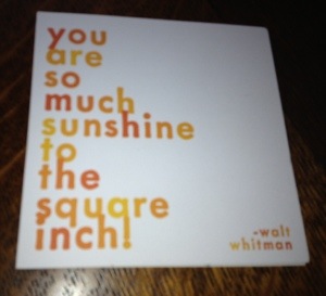 The card’s words from Walt Whitman comforted me. I felt Sarah giving me a big Menkedick sister hug as I read Walt’s words and Sarah’s words in it. And then she topped the gift off with a photocopy of Ms. Magazine’s current issue cover. Yes, it’s Wonder Woman for all my 70’s gals who grew up watching. She got a subscription to Ms. magazine for me. I love it.