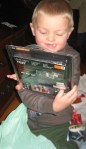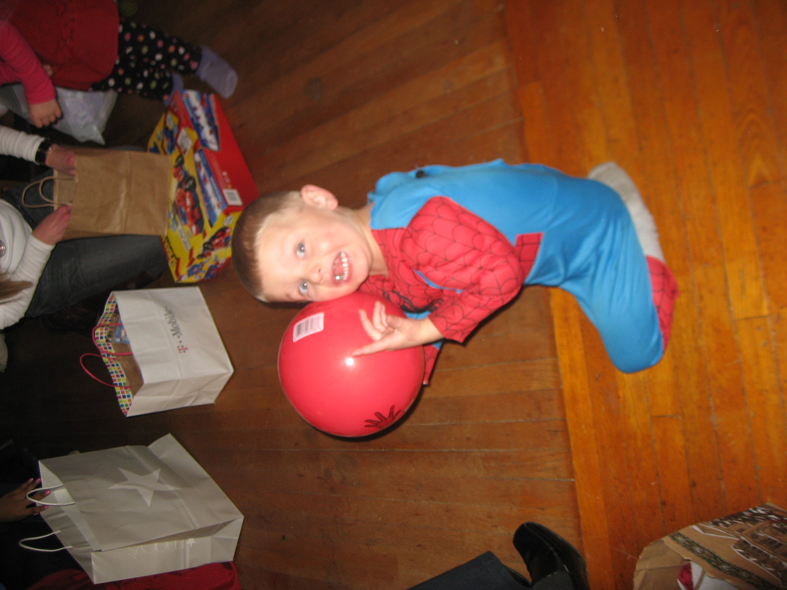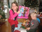 We drove home, both kids still awake at 9:30 when we arrived at the front door. It took a while for bed to actually occur and I spent the next hour preparing for Santa to come. Finally, I hit the sack around 11 pm. Poor Jon was fighting a sinus infection so he got about 3 hours of sleep. The kids awoke at 7:30 (not bad for Christmas morning) and flew down the steps to the presents. Mario ripped through all of his presents with his last one being a Spiderman web shooter. That present was the only one that caught his eye and that he actually stopped to take a breath and admire. We could have gotten him lumps of coal wrapped in tissue with the Spiderman web shooter and he would have never known. In fact, that is what Santa should have brought based on Mario’s behavior the last two months. Maria ripped through her presents, also, and seemed pleased with what she received – her favorite being her barbie dolls and Leapster. However, when she went to play the one game I got her, Globe Expedition, she returned to the room almost immediately crying about how the game was horrible.