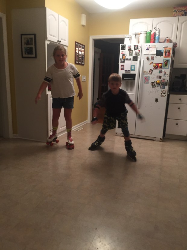 Alas, mom comes through and pushes the table out of the way so they have some room in the kitchen to skate. The small things in life that bring joy.