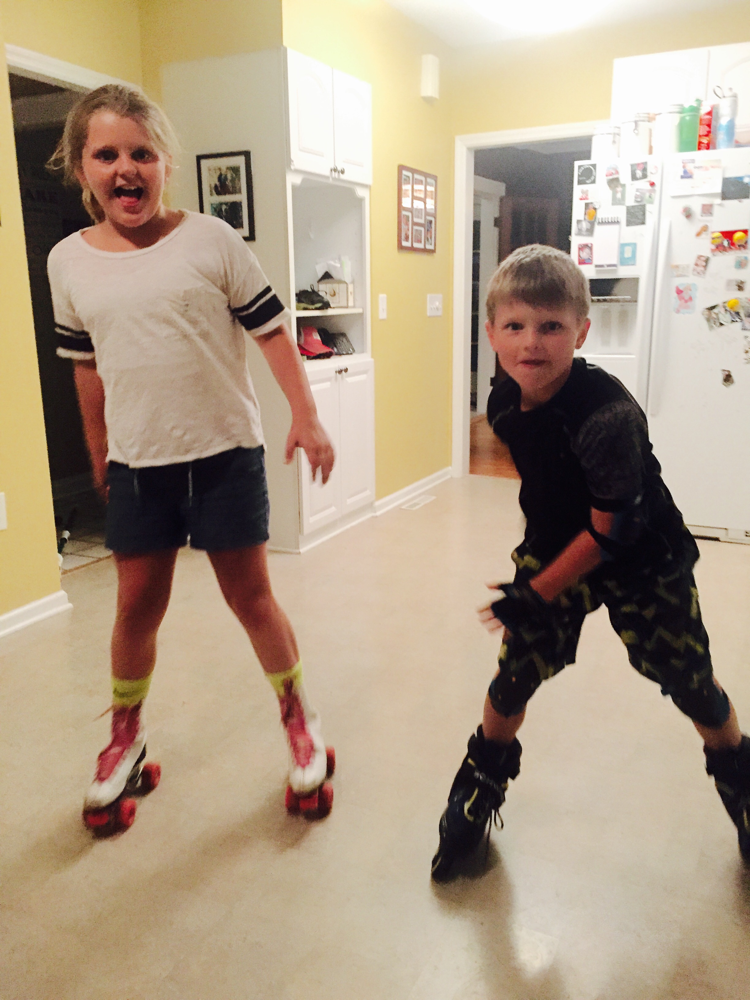 They had me cracking up the way they were running into the counter and table. That is, until Mario rammed into me as I sat on the family room floor watching them. He took out my shin, which has yet to recover, with his roller blade. Ouch. He called it a night after that collision, as well as me.