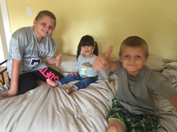 We arrived at Sarah’s house with the kids fighting over who got to present Elena with her Frozen book. Ri gave in to Mario and let him present it to her. Sarah opened the front door holding Elena in her arms. The kids yelled surprise and Elena made a hilarious “O” face and held out her hand like an officer directing traffic. She is a card! She immediately jumped down and played with the kids. Within five minutes, she was directing Ri and Mario to jump on the bed with her.
