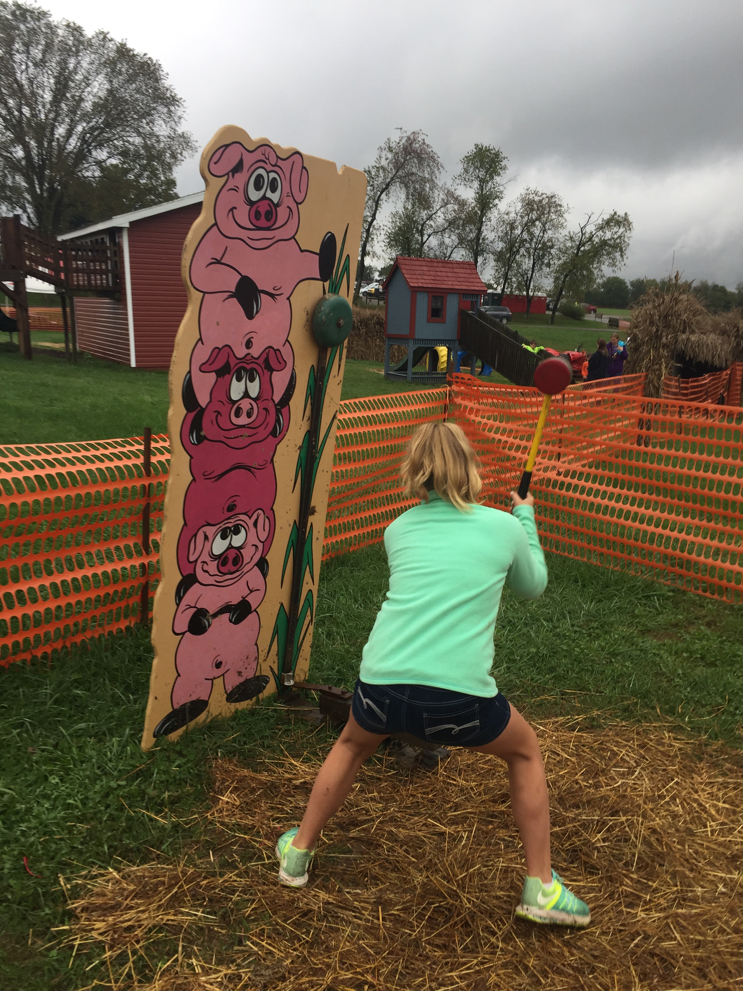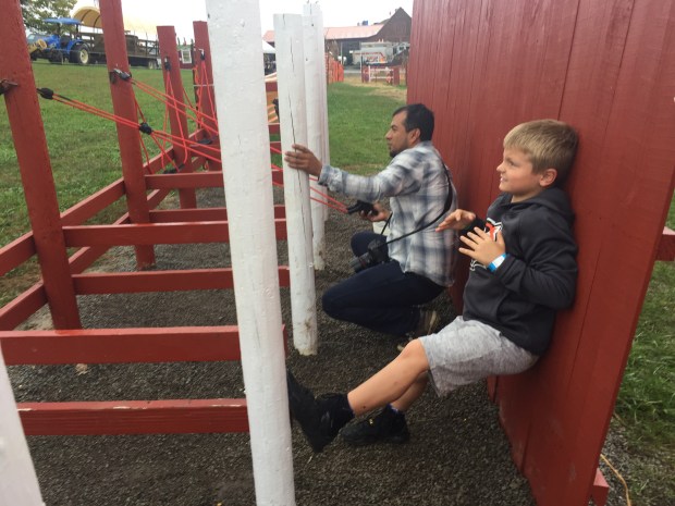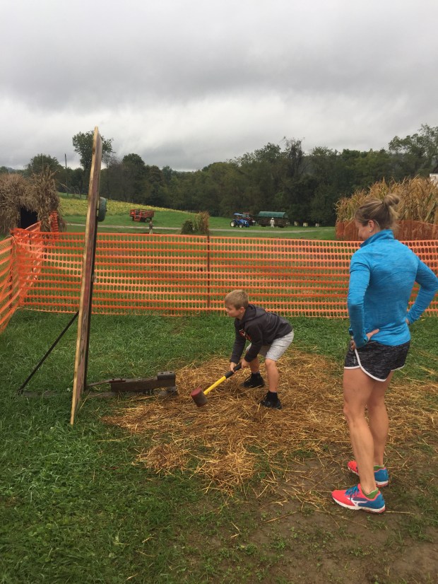 The clan headed straight to the corn maze. Mario and Maria darted into the entrance and loved trying to find their way around. I have never been a big fan of corn mazes; they freak me out. But the kids love them and Elena seemed to love it, also. At the end of the maze, they had a sledgehammer game where you try to hit the ball to reach the bell at the top. It looked a lot easier than it was, I can say that much. Mario tried with all of his might to get it up to the top. He accomplished the feat on the miniature one!