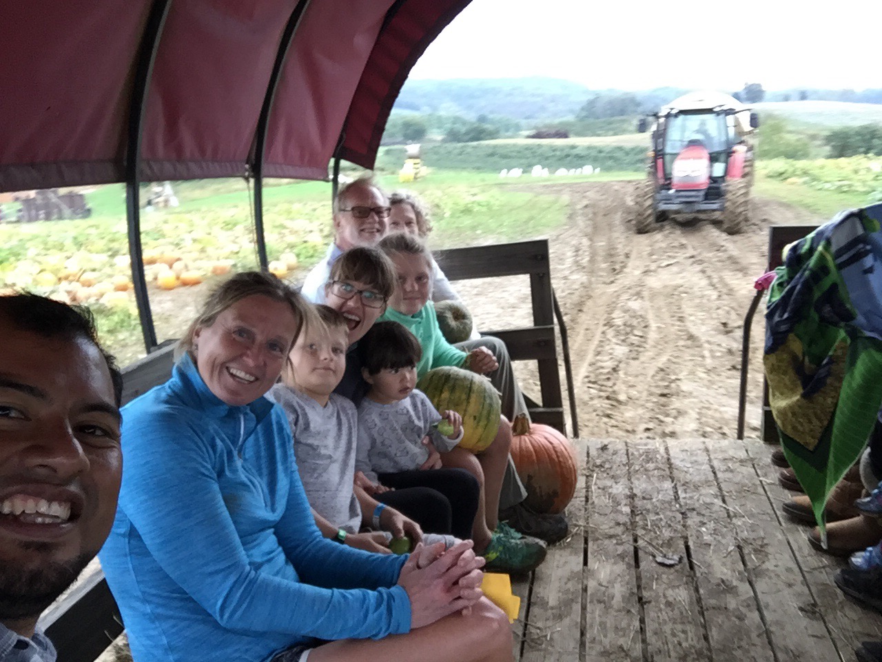 Our last activity was the hay ride to find pumpkins. We found Elena a tiny  pumpkin as we looked for the most perfect colored and shaped pumpkin in the patch to put on our porches. I loved a white squat one but another person grabbed it. Mario nabbed a pretty bright orange one with a curved stem. Maria ended up with a monster of a pumpkin weighing 32 pounds! I got a multicolored one – green and orange. We all walked away happy.