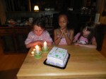 I was ready for some food after all of the activities. So were the girls. We chowed on homemade Boboli pizzas while sitting on the screened in porch – a slight breeze hitting our skin and the sounds of evening surrounding us. Presents came next. Ri scored some cowboy boots and horse galoshes from Meg and dad, American girl clothes from Alana, a game from Sarah and Jorge, and a watch from Sophie. She hugged everyone with her monster hug squeeze and we were ready for cake.