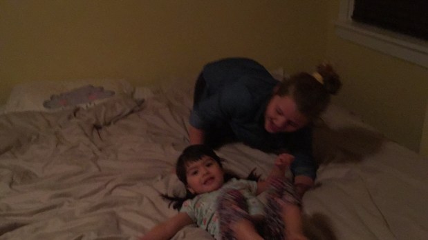 Maria and I got into a routine every morning. We would hear Elena wake up, usually at 7 am, and ask Sarah “where is Aunt Mary? Where is Meemaw?” She would open the door to the guest room and climb into bed with us. No snuggling time though; instead, it was straight to jumping. Ri and I pulled ourselves up out of the covers and watched her jump and land on her butt. She’d yell “I landed on my butt!”
