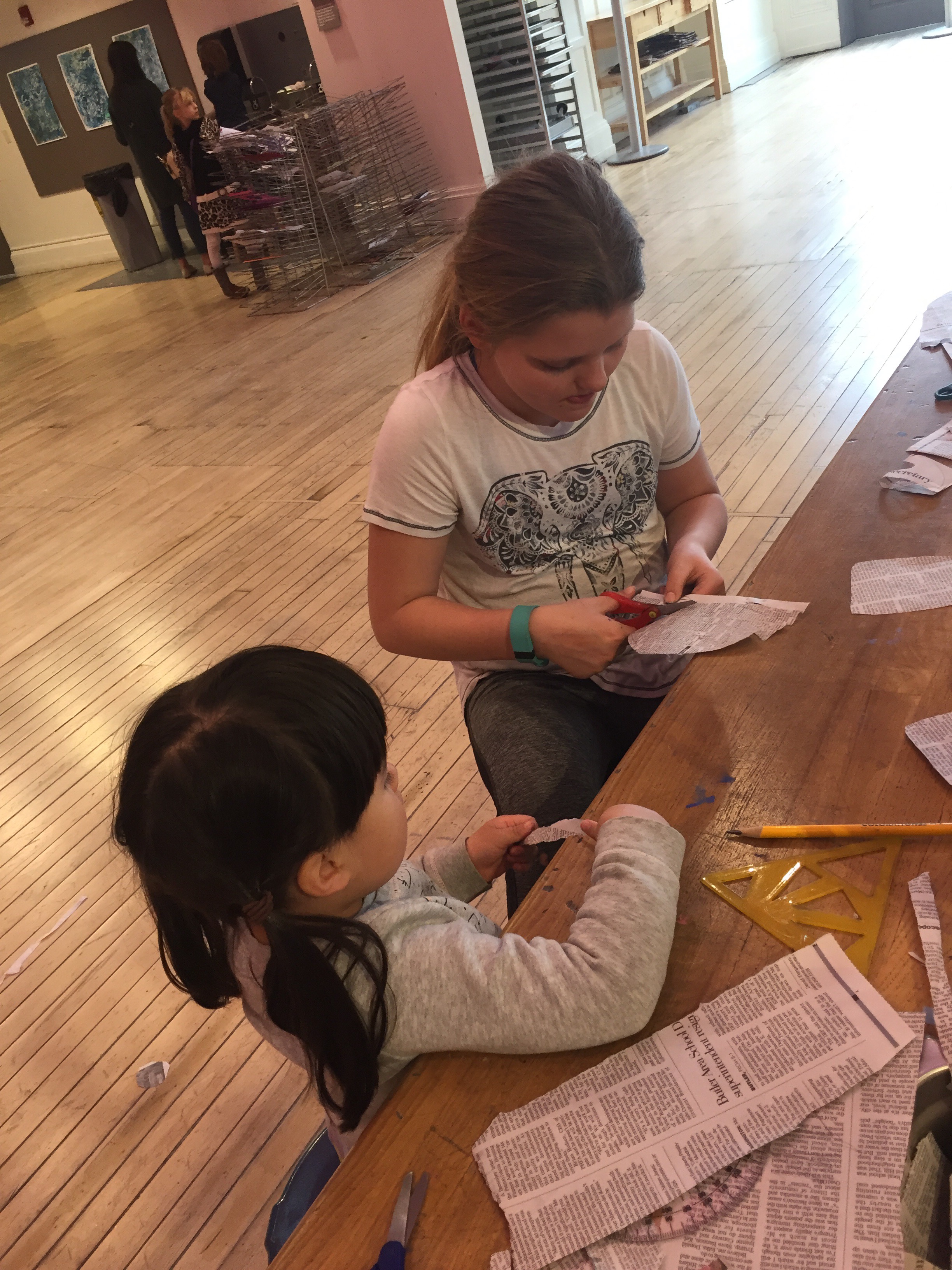 Elena was hilarious in the art room. Maria wanted to stay in the silk screen station to make a collage for Elena’s room so she was parked there for 45 minutes. Elena sat there for the entire time making newspaper bracelets for me. She would tape a piece of newspaper around my wrist, draw on it, and then cut it off. This process was repeated several times over but with the same glee as the first time.