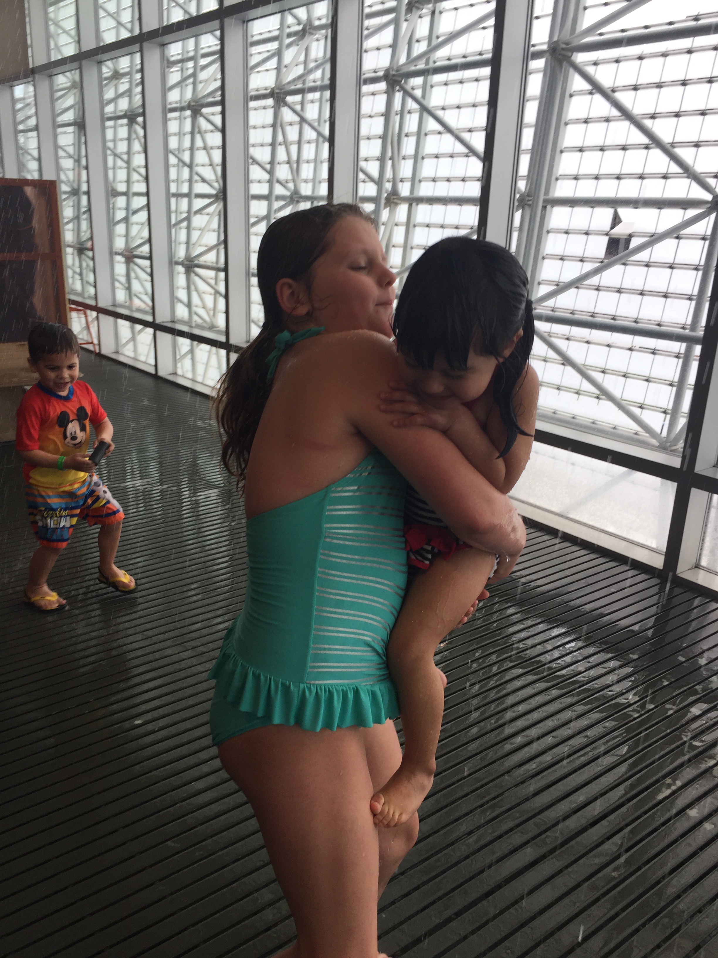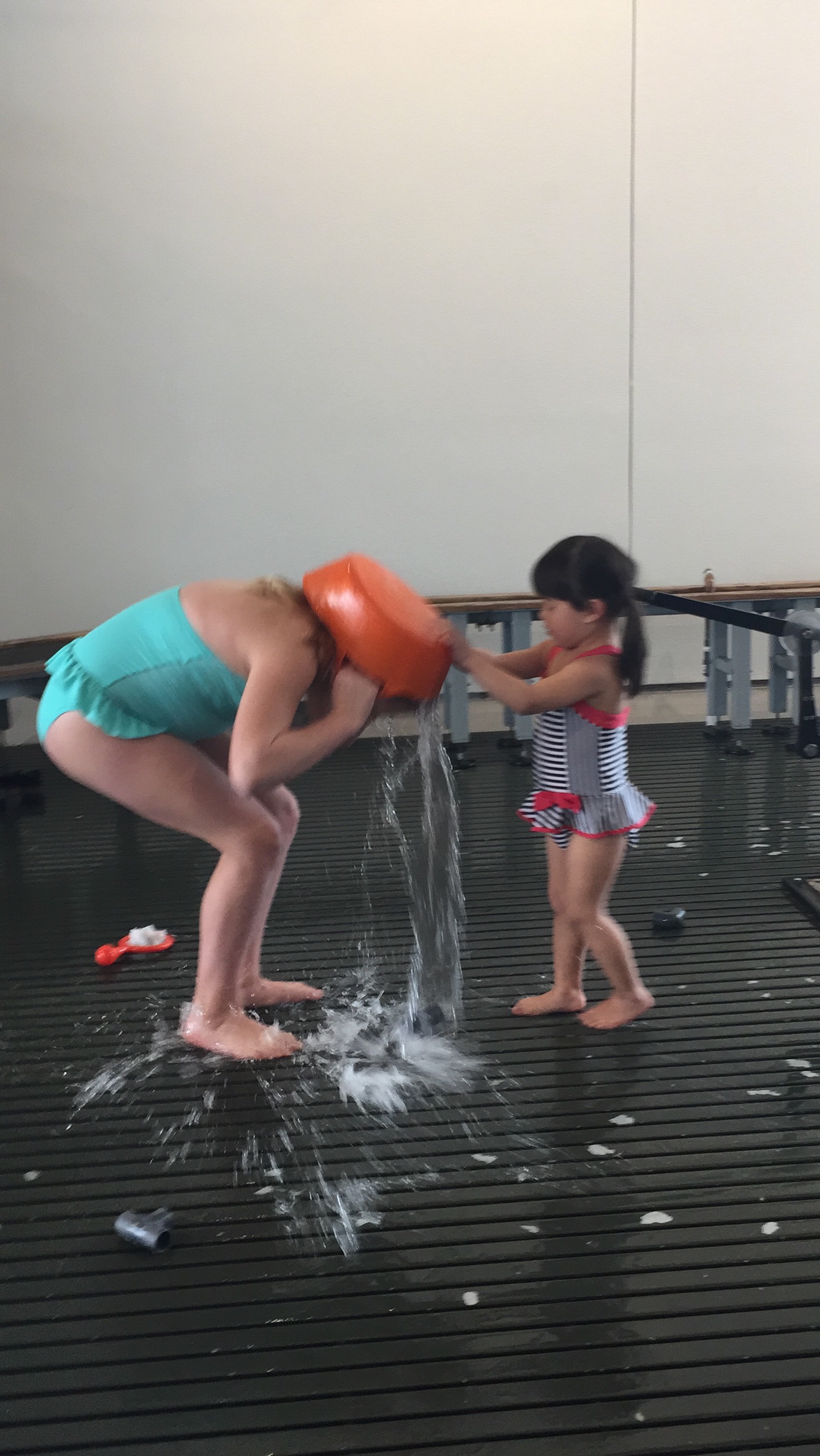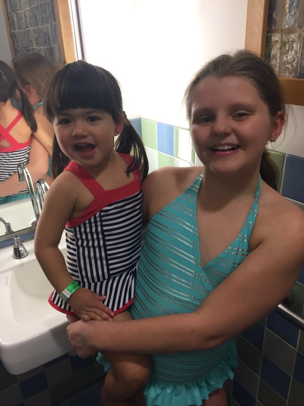 Next, we went up to the water play area. Maria was so excited to get in her bathing suit with Elena. At first, Elena was hesitant to go into the sprinklers with Maria but then she warmed up to it and began to allow Maria to run through the sprinklers holding her. Maria allowed Elena to dump a bucket of water on her head. The more water she can pour on herself, the better. Elena hung in with the water-loving Ri for a while but then went from loving the water play to “let’s go home!” We had a trying time getting dry because we didn’t bring towels. We may have killed a couple of trees in the process of drying off.