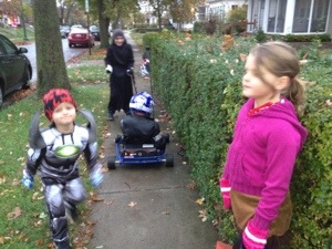 Mario and his buddies lasted until 7:15. I was not at the house when he returned or I would have forced him back outside until 8:00. He’s lucky…. Ri called me at around the same time Mario stopped trick-or-treating. She asked if Jon or I could pick her up. I was still out with my girlfriend’s daughter so I told her Jon would pick her up but she needed to walk with me and Mackenzie for a block to get the last bit of candy. She sighed but obliged because she loves me.