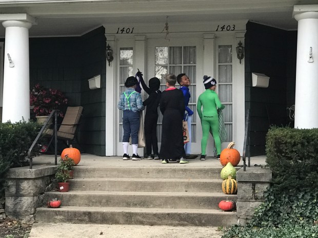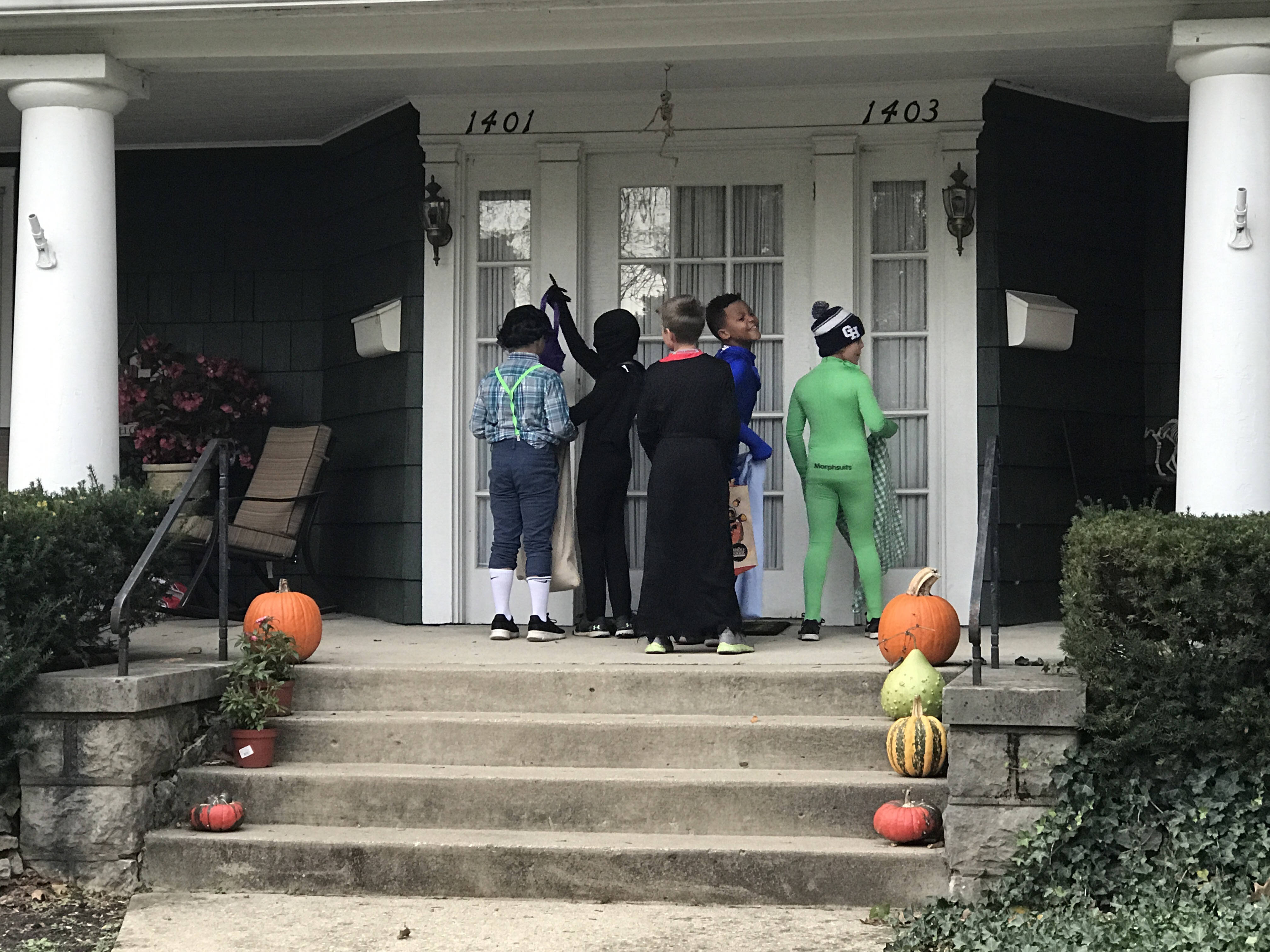 Both kids got invited to friends’ houses to have dinner before Halloween and then go out with a huge crew of folks. Maria got dressed at the house and then met her M&M partner over at her friend’s house. She allowed me to straighten her hair and put it in ponytails, which made me very happy. I think she has allowed me to do her hair about five times through her entire life. Mario got dressed on his own and Jon and I cracked up when he came downstairs. He looked absolutely ridiculous, and he embraced it. I gave them each a pillow sack to use to hold all their candy, and told them they better not come home until it was filled to the top. My usual instructions year in and year out. They rarely disappoint.