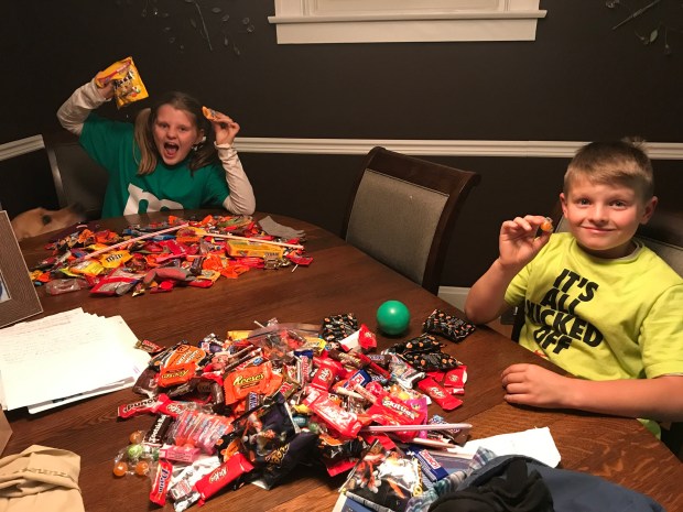 We walked back to the house Mario and Jon were at, ate a few chips, and headed home. The kids laid out their candy on the dining room table as they have in years’ past and examined all they got. Mario couldn’t get too excited because he was ready to barf from eating 20+ pieces while out with his friends. You can see the nausea on his face!