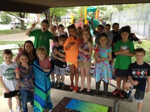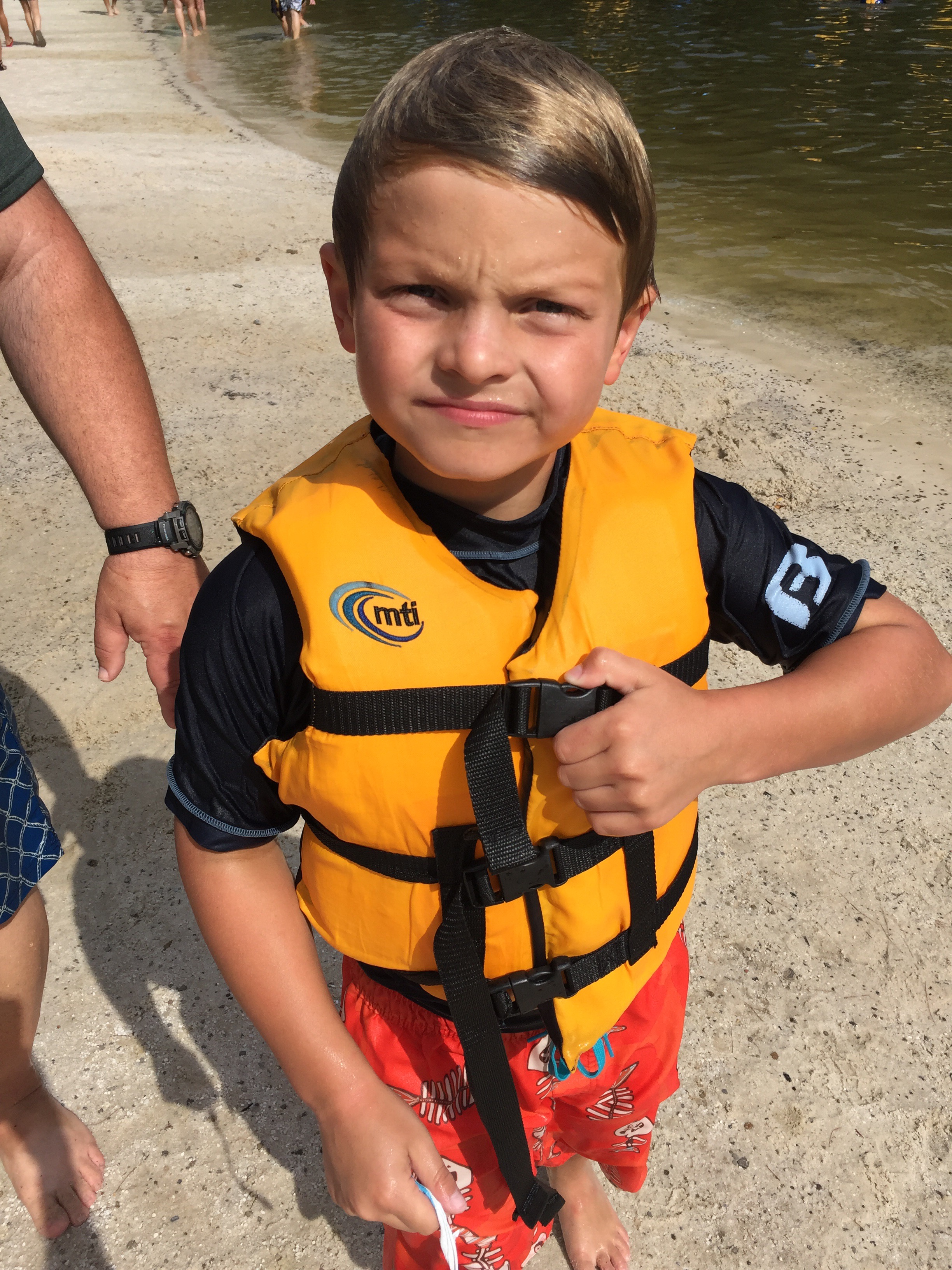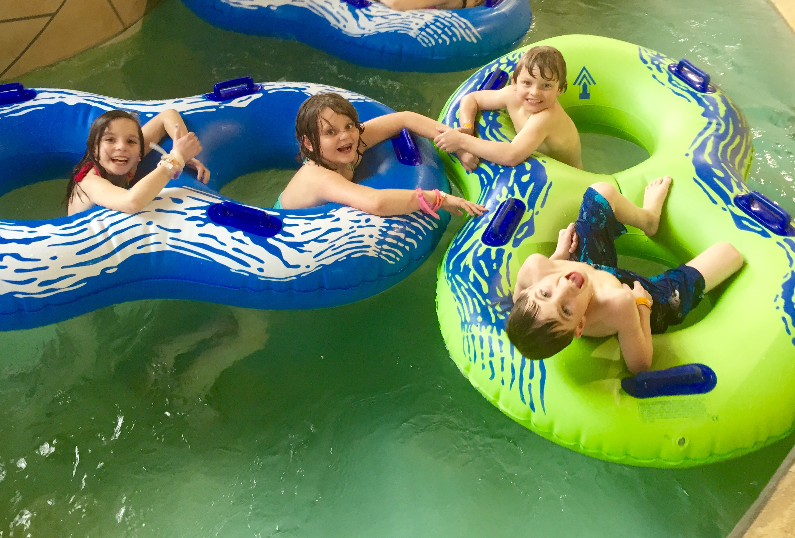 - We arrived at check-in time at the welcome center. They explained the layout to us and we took a look at the lake. It looked just like the pictures with the giant blob floating near the beach and obstacles scattered throughout the water. Our chalet was about a half of a mile away from the welcome center right off an unpaved road next to a pond. Mario was excited to be next to the pond so that he could fish in the morning (he never ended up fishing in the morning but it sounded good; he did fish with some guys from Marietta one night; saw them the next day and they remembered his name calling out “hey Mario” – he loves that). The kids tore through the chalet to get a feel for where everything was, including their bedroom. They threw their bags down and went straight outside to the hot tub on the back porch. The hot tub was a huge hit throughout the trip. The kids would go in both morning and evening, and Jon and I loved relaxing in it after the kids went to bed.
