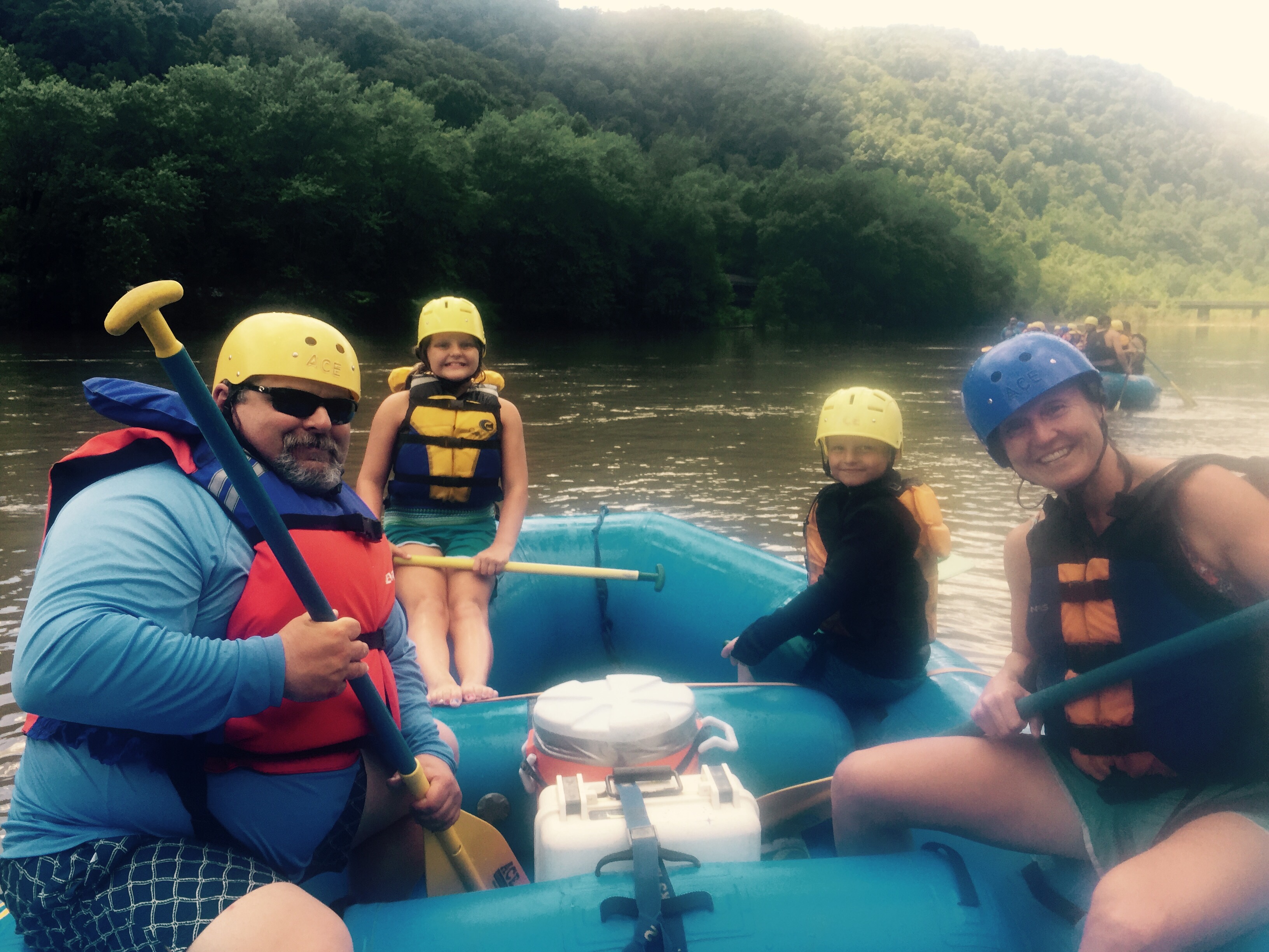 The next morning we had our white water rafting trip. Jon is the only one of us who had gone rafting before. When I told him I had booked the Lower New River he flinched. He thought the rapids may be too much for the kids’ first trip especially because of the flooding West Virginia incurred a couple weeks earlier. A guide had called us the night before and told us that our rafting would likely be canceled due to the flooding but that we could select the New River which was more calm. I knew Maria would want the more adventurous route, so I was inclined to wait to see if the river would go down in a few days and we could still do the Lower. But Jon was fairly adamant that he thought we should just stick with the Upper New River tour. I conceded to Jon since Sunday looked like such a beautiful day to be on the river. Thank goodness I listened to my husband. I about lost it on our first rapid; it was scary as heck. The guide told us that a majority of our trip on the Lower New River would have been the Rapids we went through at the beginning. Again, I thanked Jon for convincing me.