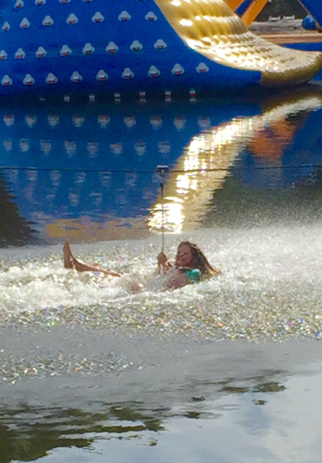 She crawled to the end of the blob and sat down with her legs out and her torso leaning forward. The lifeguard at the landing asked her if she was ready and she gave a thumbs up. However, the woman that was going to blob her did not count down for her so she was not ready to pop up. In addition, the woman probably outweighed her by 150 pounds. John and I looked on a bit frightened for her. And then there she went – twirling up in the air – with an unpleasant descent into the water.