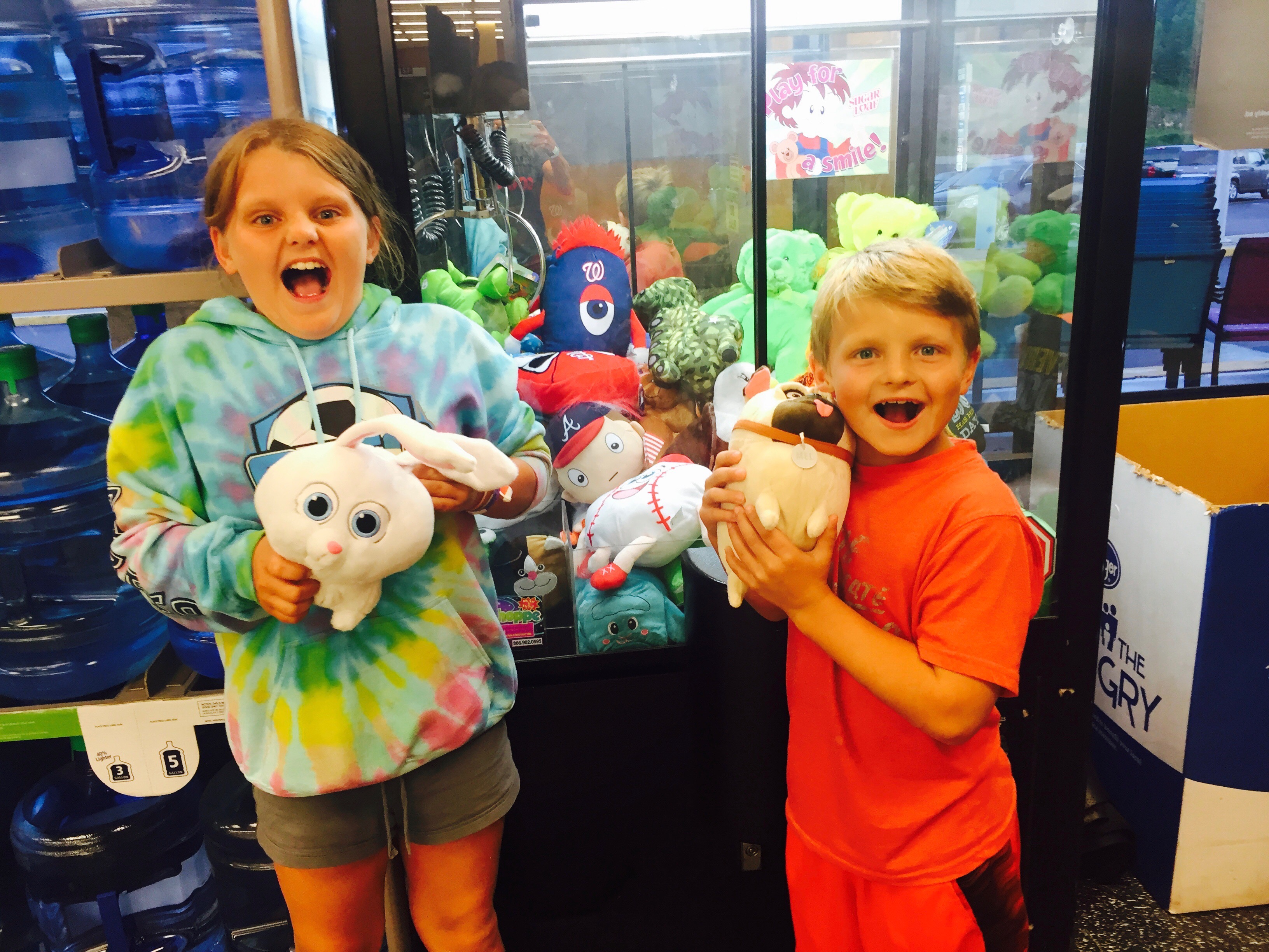 This was also the night that Mario found the claw game. He loves trying to win an animal. He had won three at the lake with Jon. He found a little stuffed dog from the movie “The Secret Life of Pets” and he wanted to win it. He won it after two tries. Ridiculous. Then he wanted to win a pet for Maria. We spent $10 trying to get the rabbit from the movie. He had it numerous times but then it would fall out of the claw. So frustrating! Of course, if they had a rational mom, we would have left. But I wanted to win it. So, we went out to Jon and got five more dollars. And my boy won it after two tries again so we walked back out with four dollars left. Yea (forget the ten we spent earlier…)!