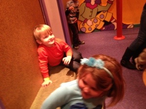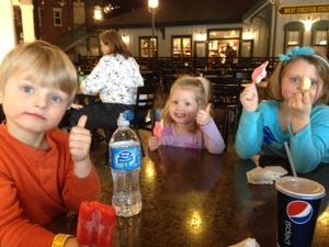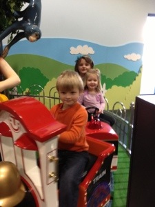 The kids got to fly a simulated flying machine. They were scared when they dipped down between tall buildings. It was hilarious to watch. They played in the penguin area with Elena. We went to storytime, which cracked us up due to the very animated older lady who read the book to us. We fed chickens after the book (the kids were pros due to MamaMeg and Peepaw’s house). We walked around to see the different birds, which Elena helped us identify. We ate lunch; the start of our fabulous eating routine. Here is Sarah and Jorge with all of their organics and granola, and here we are getting carry out pizza and chicken nuggets everywhere we go.
