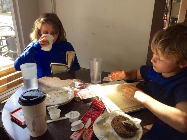 It was a good thing that Mario stayed back because the graduation included an hour and a half of graduate readings. Each grad read a piece of their work for five minutes. I gave Ri the iPad but hoped she would listen to the stories. I didn’t think she spent too much time listening until she and I were walking to Stauf’s this week and I said “let’s make up a poem. I will start. One day I walked in the woods.”