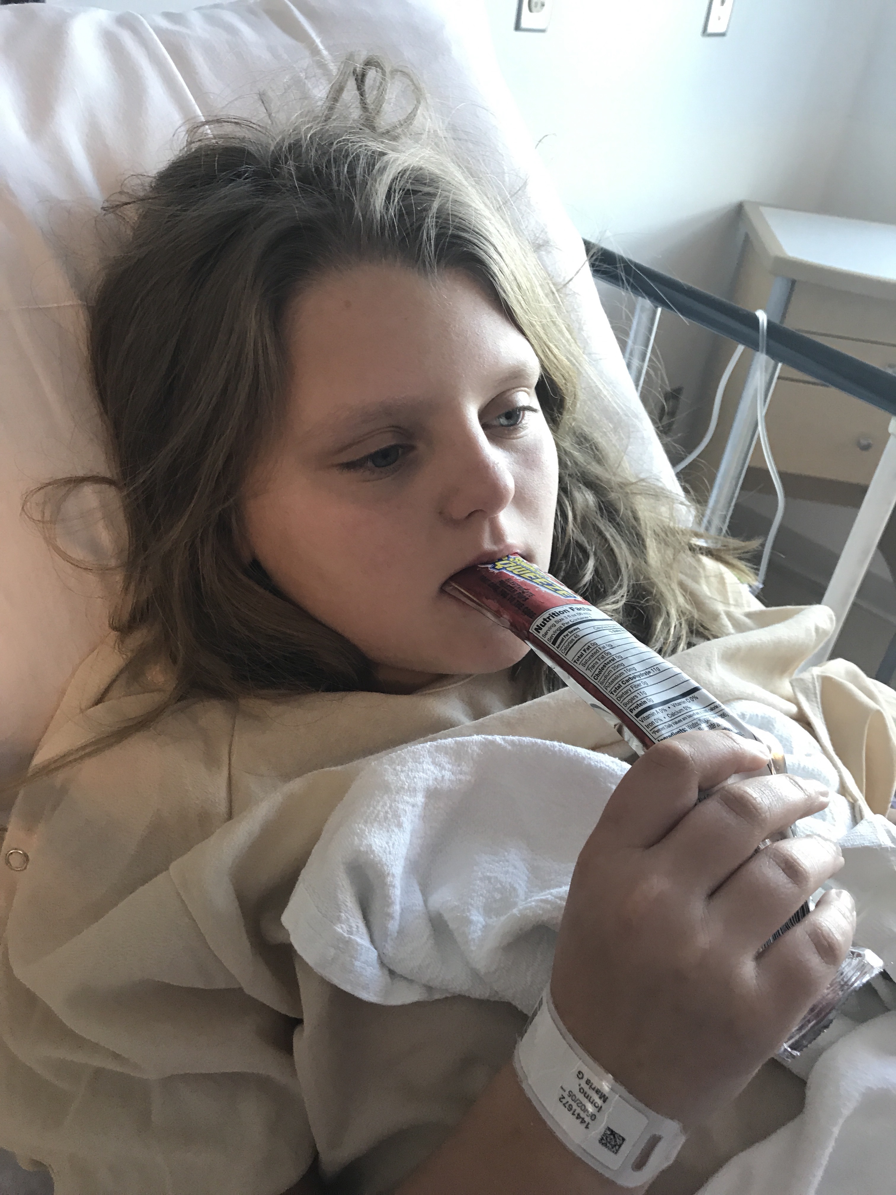 She switched off belting out tunes on the way home and sleeping. A good little patient. We got her home and she laid in bed watching TV and sucking on Popsicles. She didn’t make any ruckus; she didn’t call on Jon and I hardly at all. This is going to be a piece of cake, we thought. She slept well that evening, too. Machine! The next day, she felt a little sick to her stomach but was still in good spirits. She didn’t want to eat much so she continued with the Popsicles and abided by Our charge to take sips of water every hour. I even went to work for the afternoon and left Jon with her. He reported that she didn’t need much – an occasional new glass of water or a popsicle – but most of the time she was fine watching her TV and working on some homework. I thought she may even be able to go to school on Wednesday!