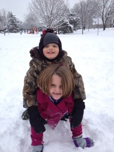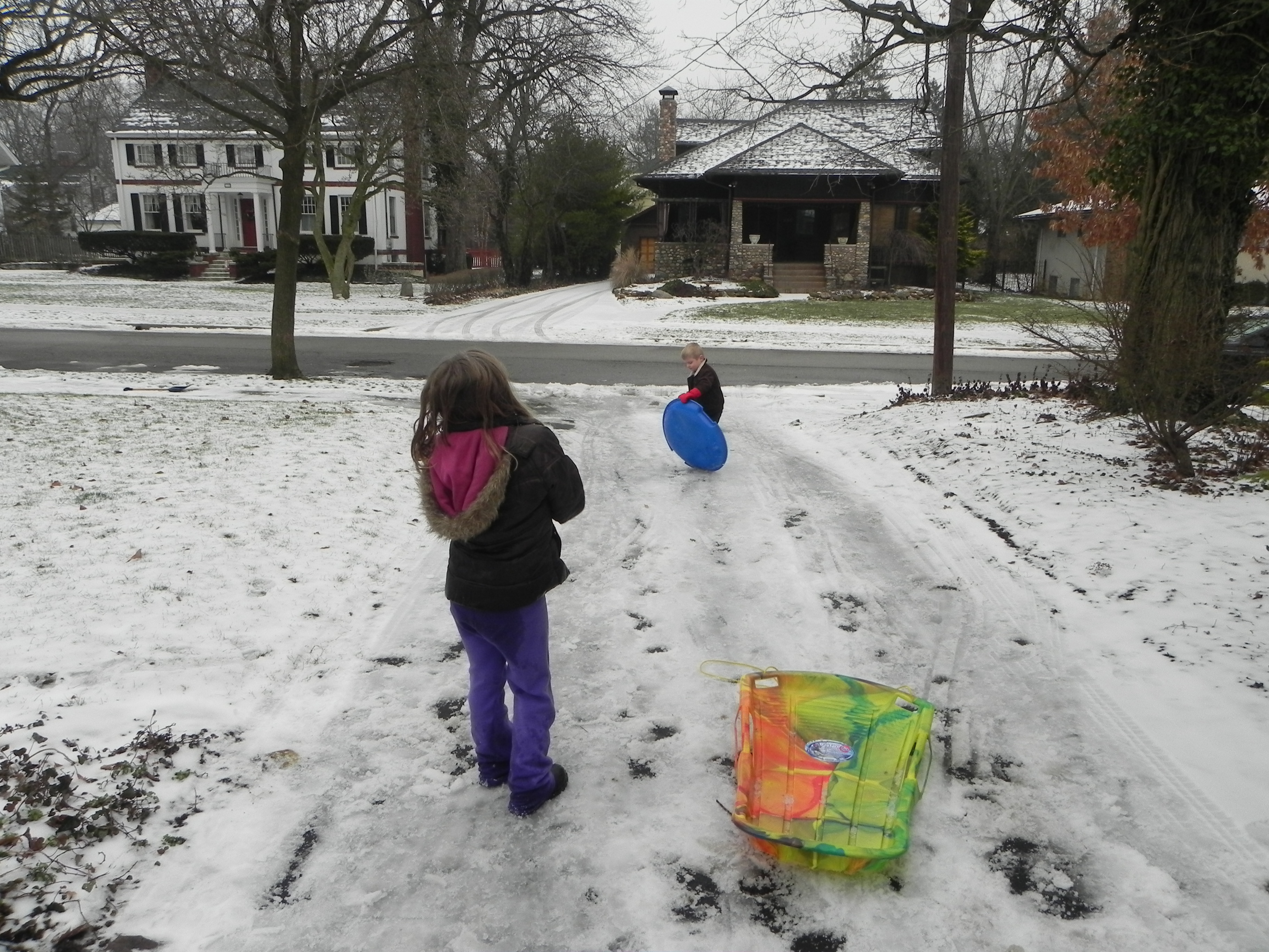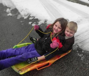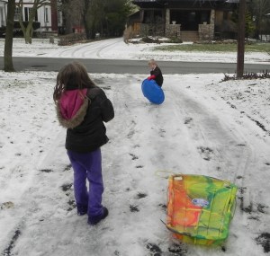 funny because Ri showed up with her friend, Anna to sled an hour after we arrived and she had on a huge pair of brown bib overalls that did not fit her at all but she could have cared less. They all had a blast going down the hill, engaging in a massive snow ball fight, and making a ramp to jump over.